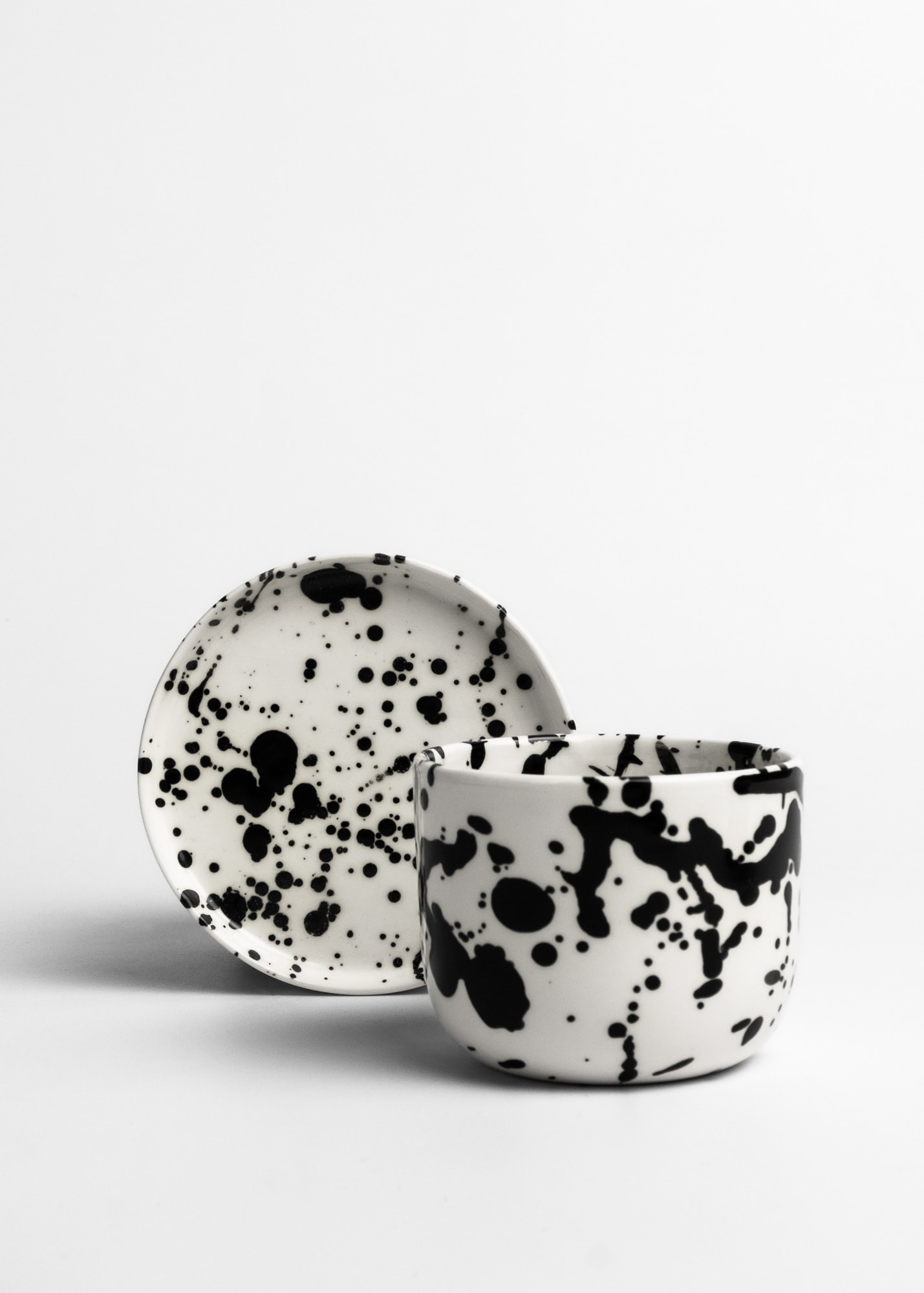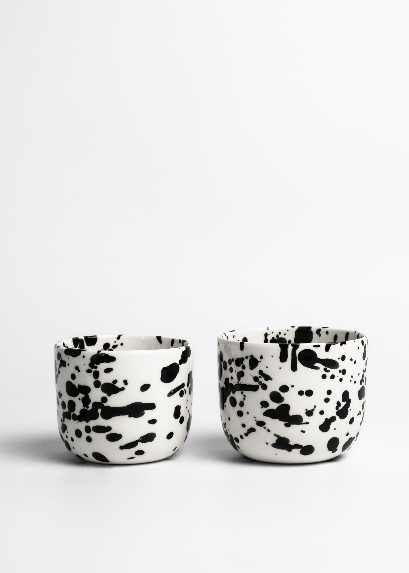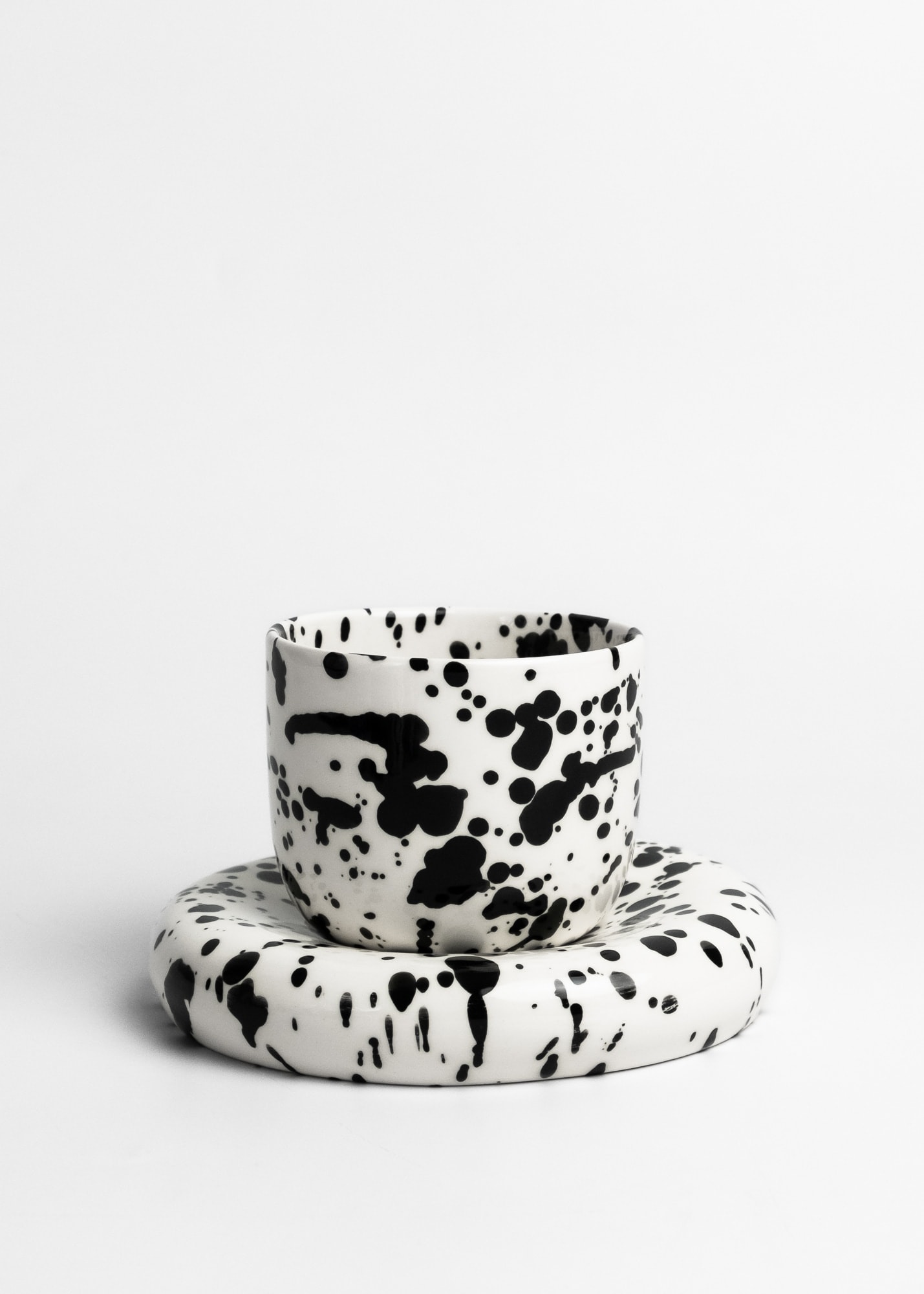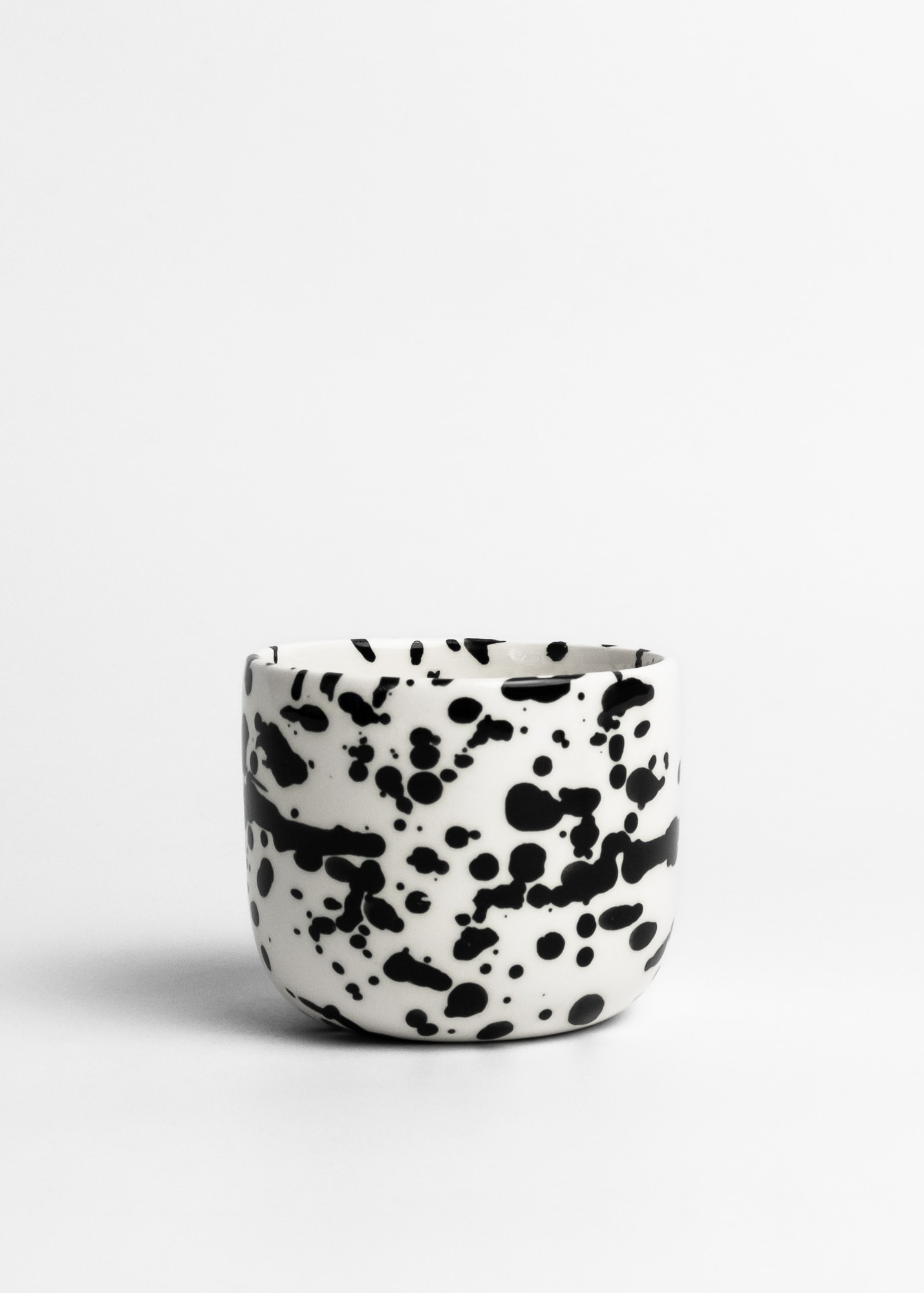 White cup with black splashes inside and outside, made with porcelain.