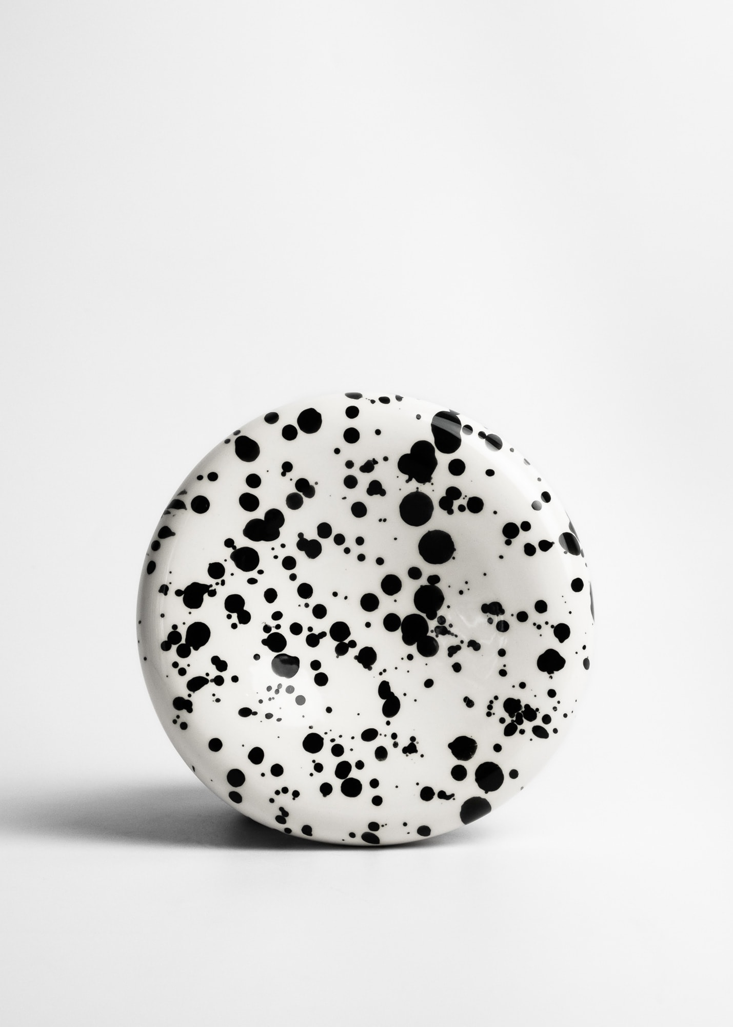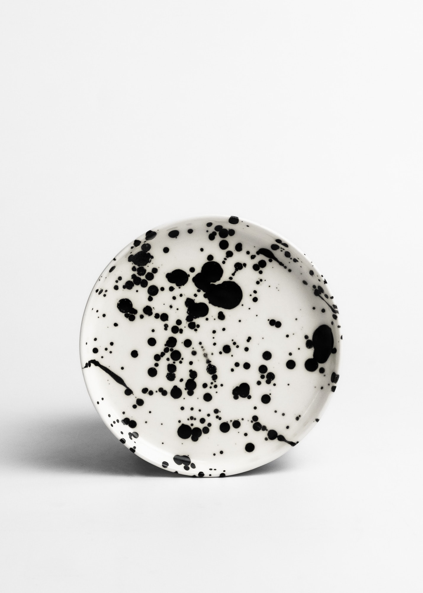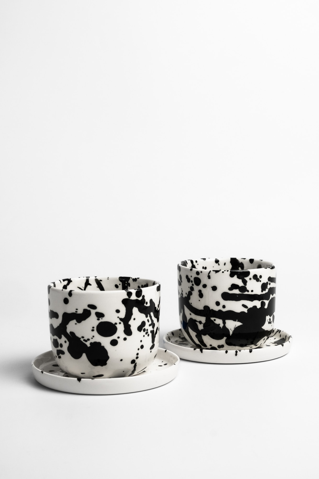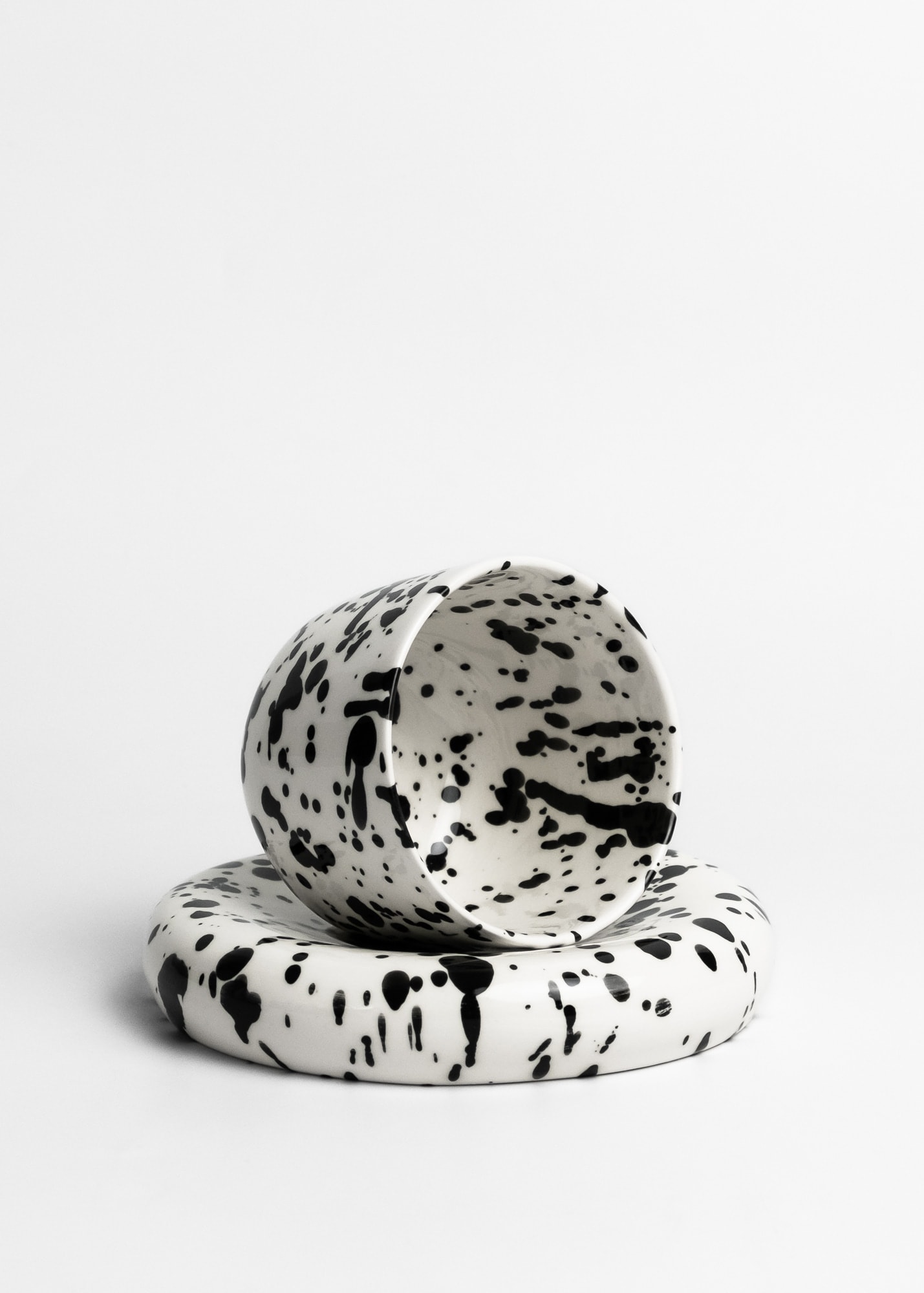 White cup with black splashes inside and outside, made with porcelain.