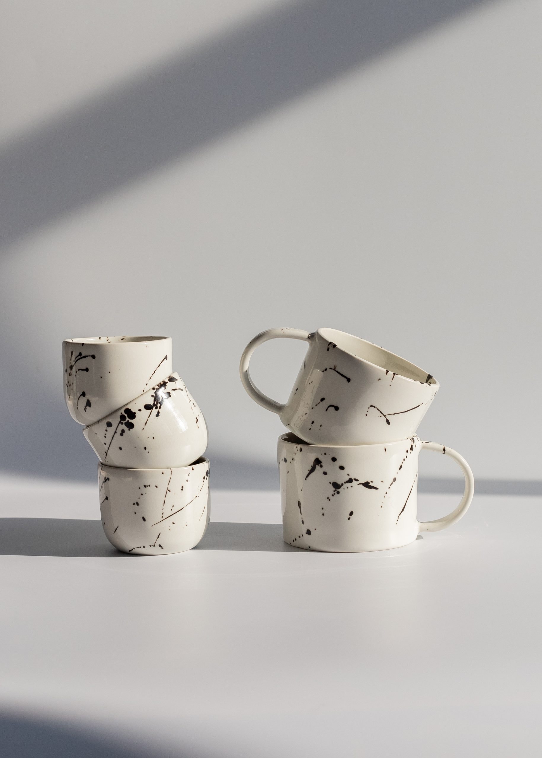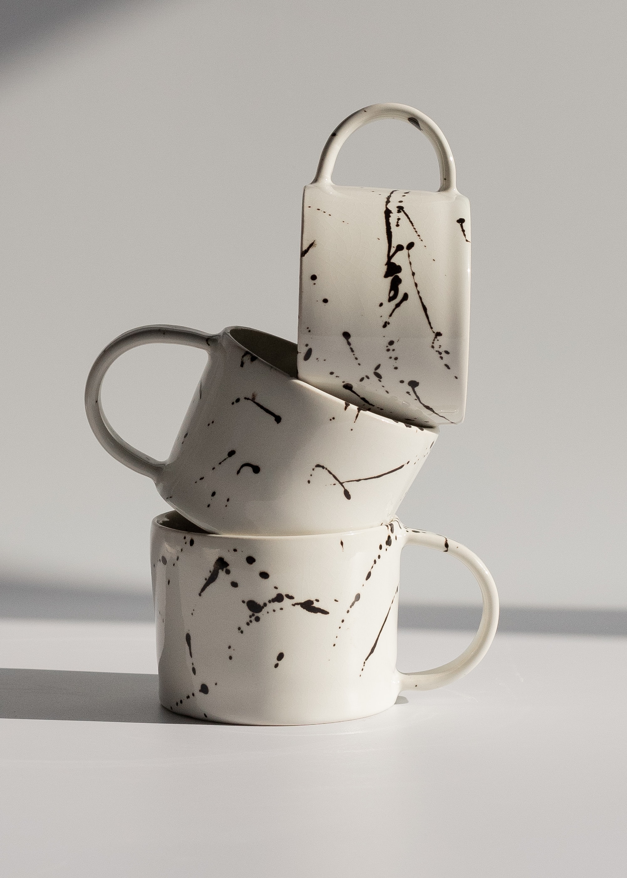 White stoneware mug with black splashes.