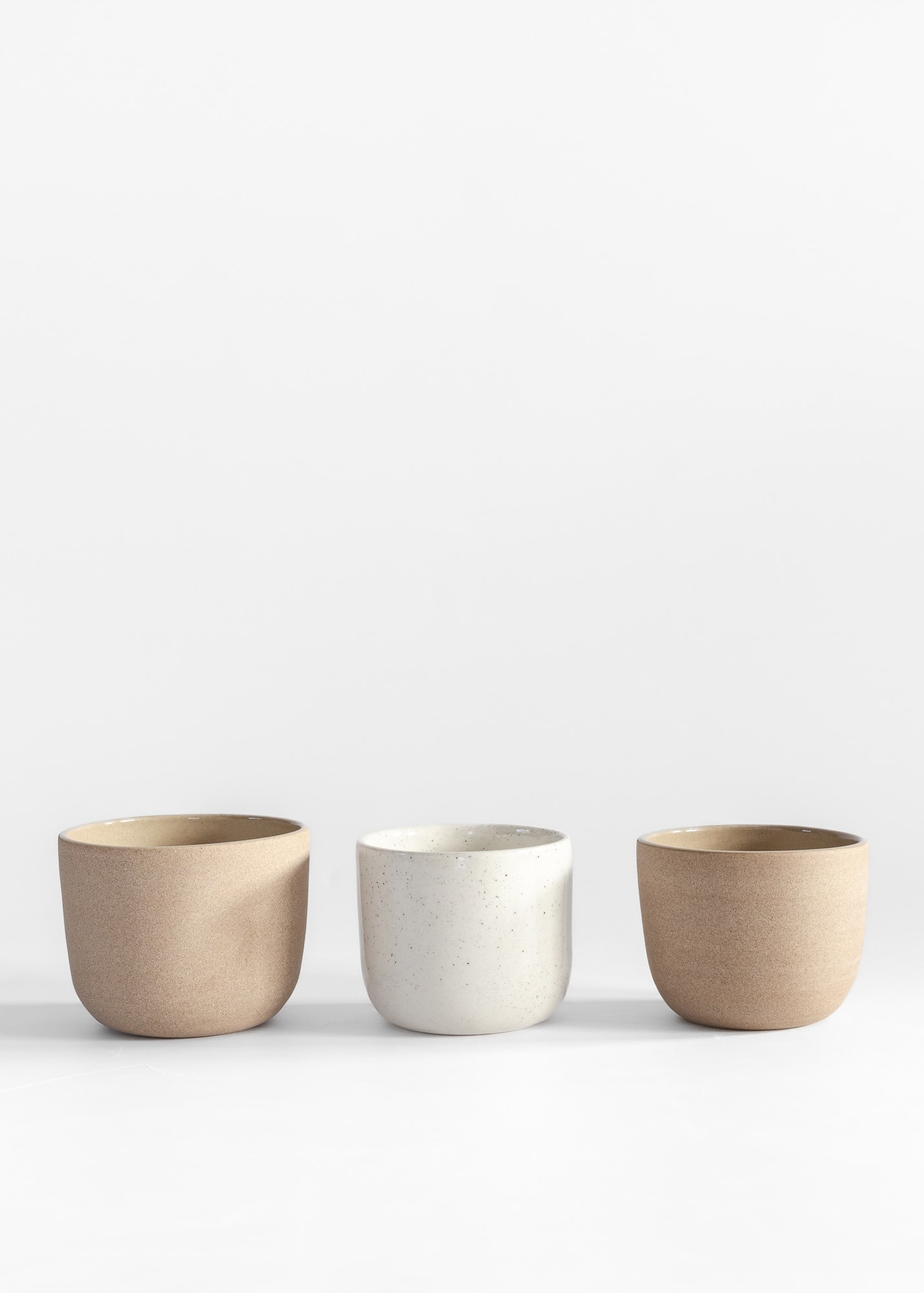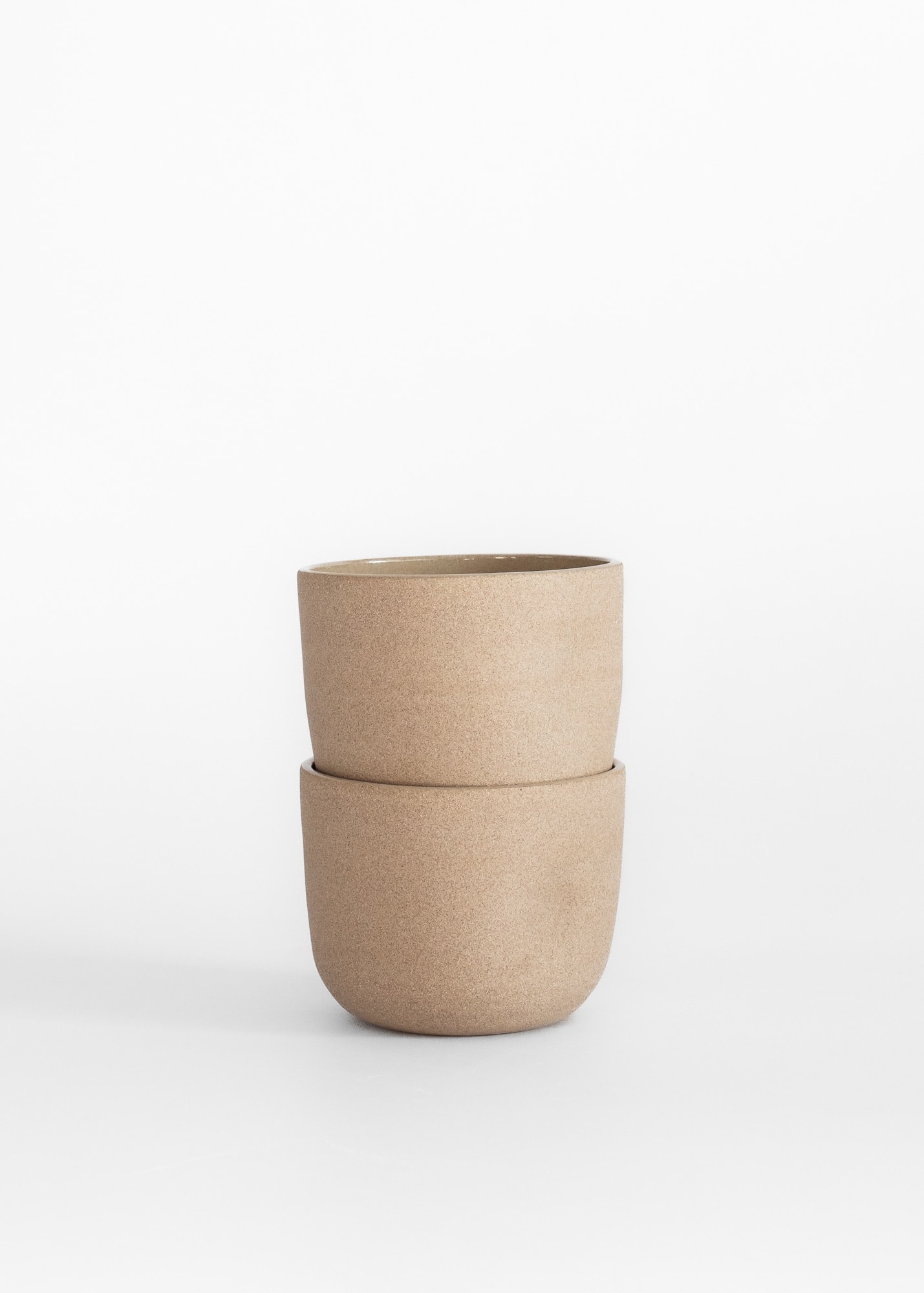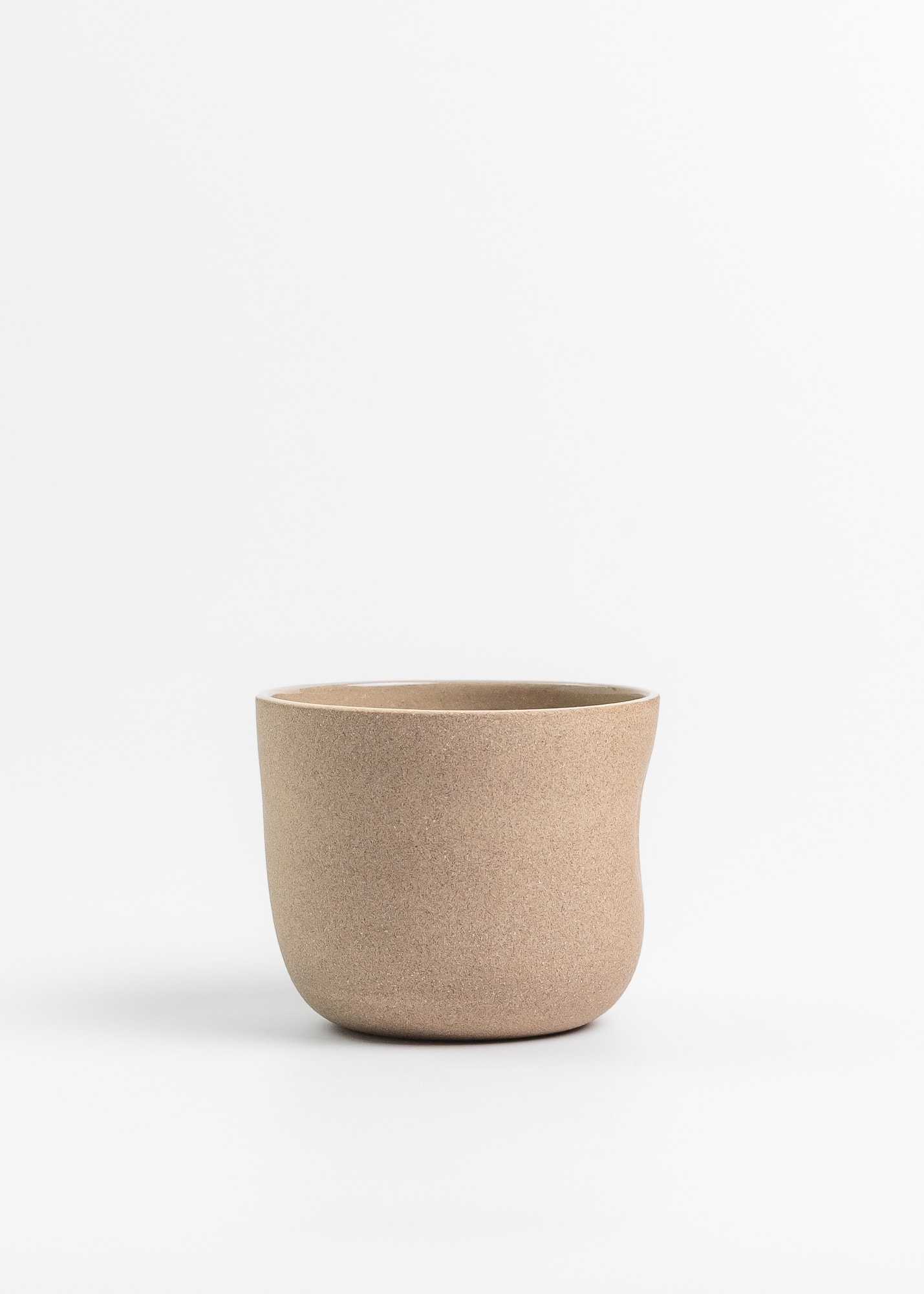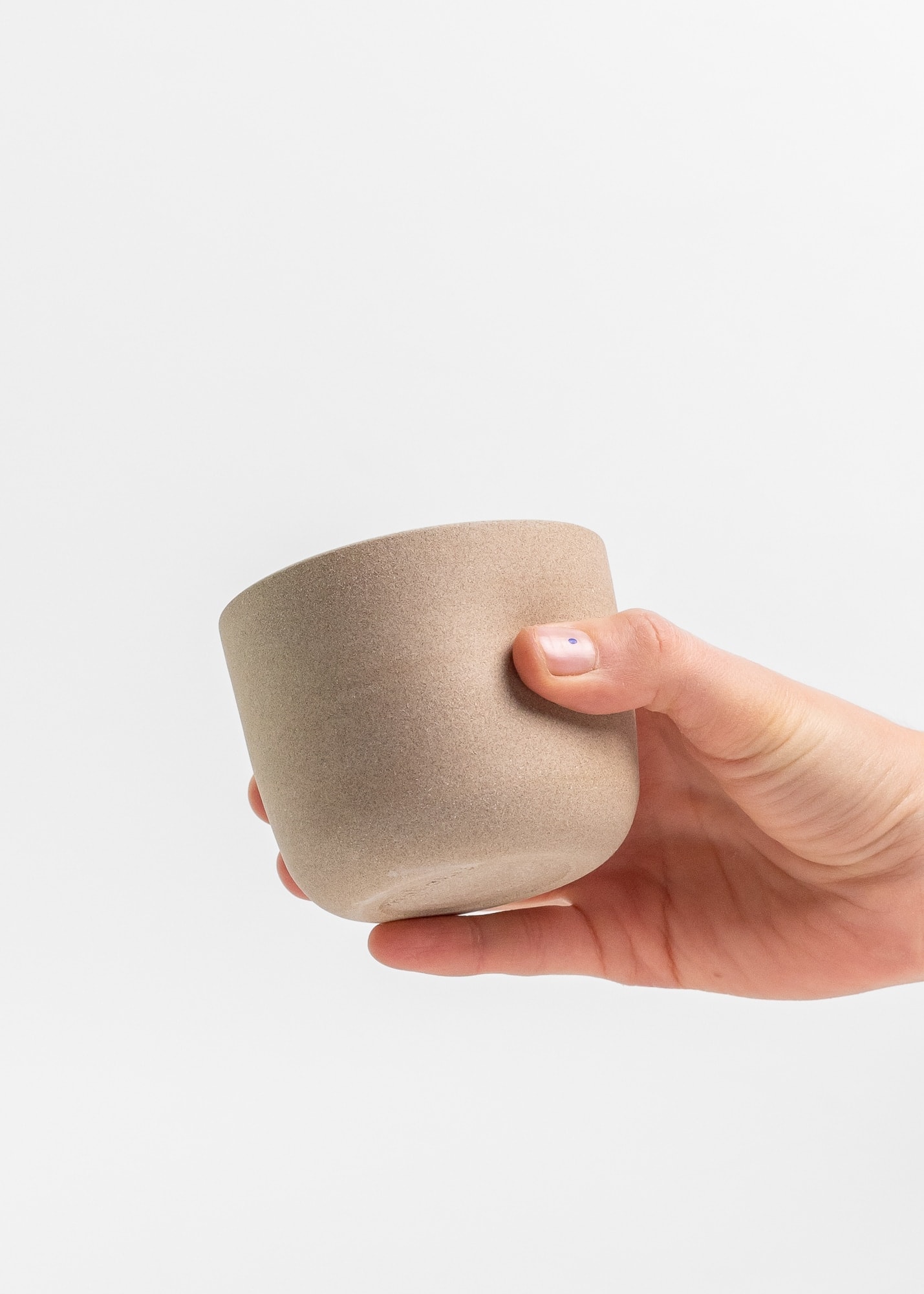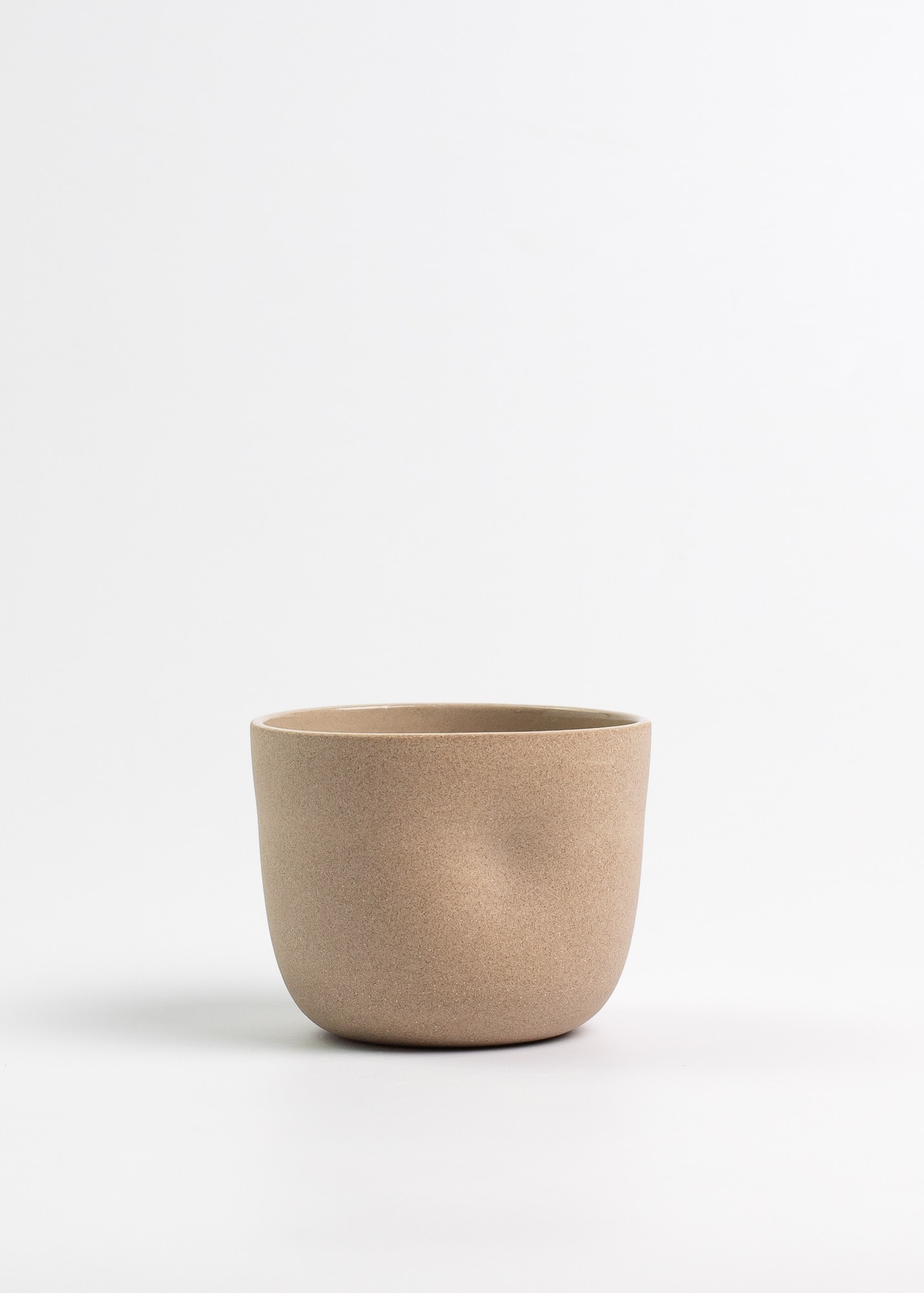 Minimal light brown stoneware ceramic coffee cup, with a dent for thumb for an even more comfortable hold.