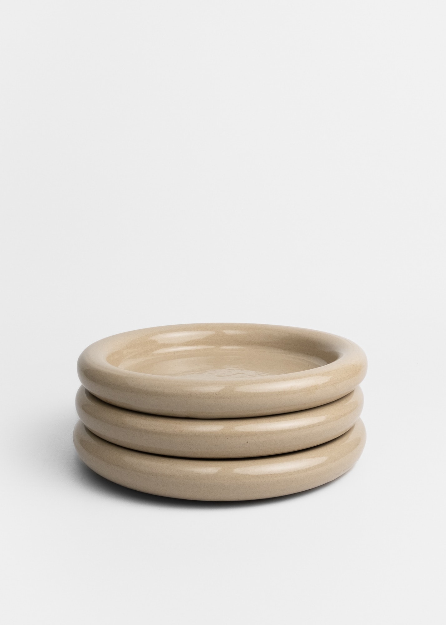 Minimal light brown tones chunky stoneware plate in a donut shape.
