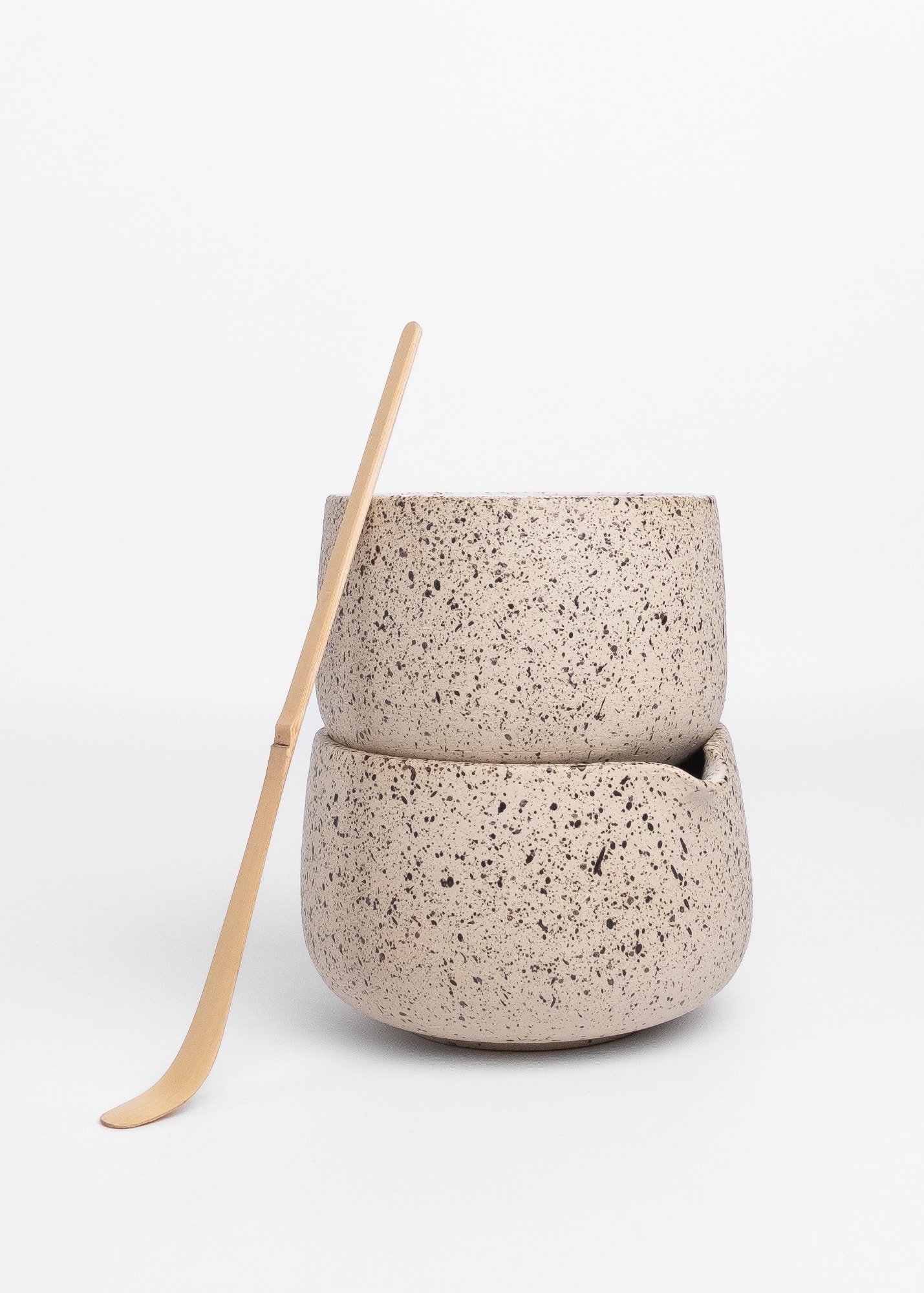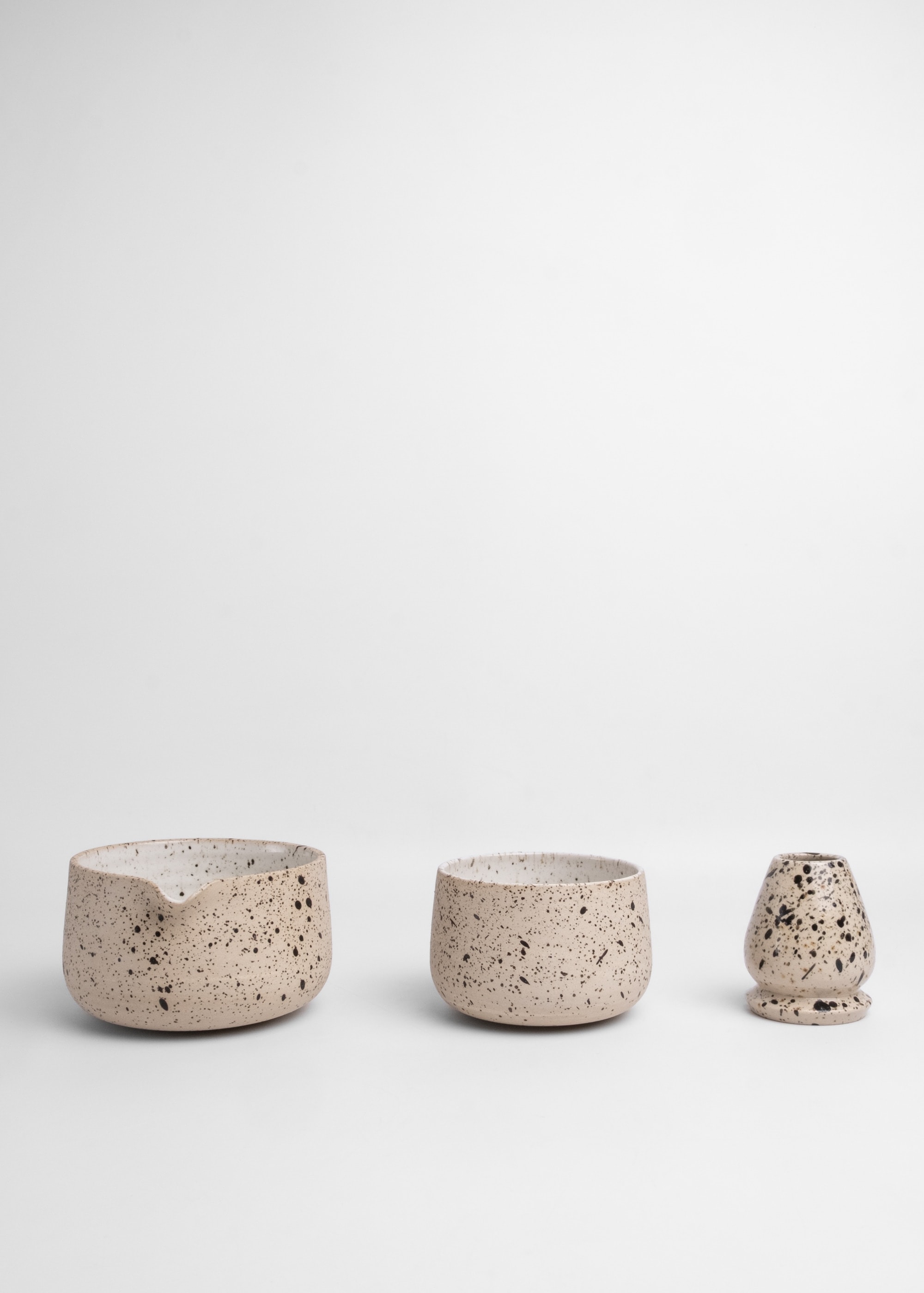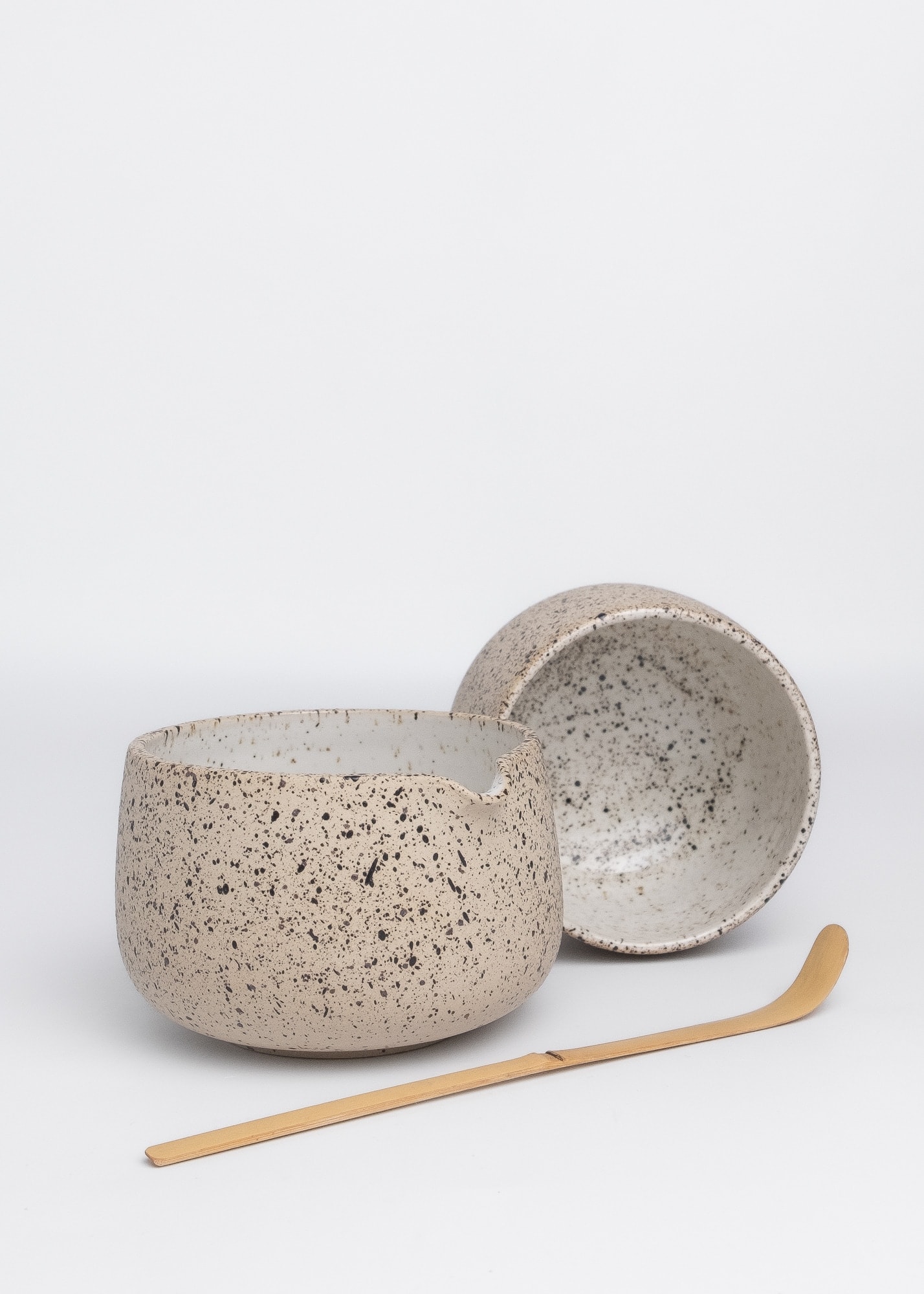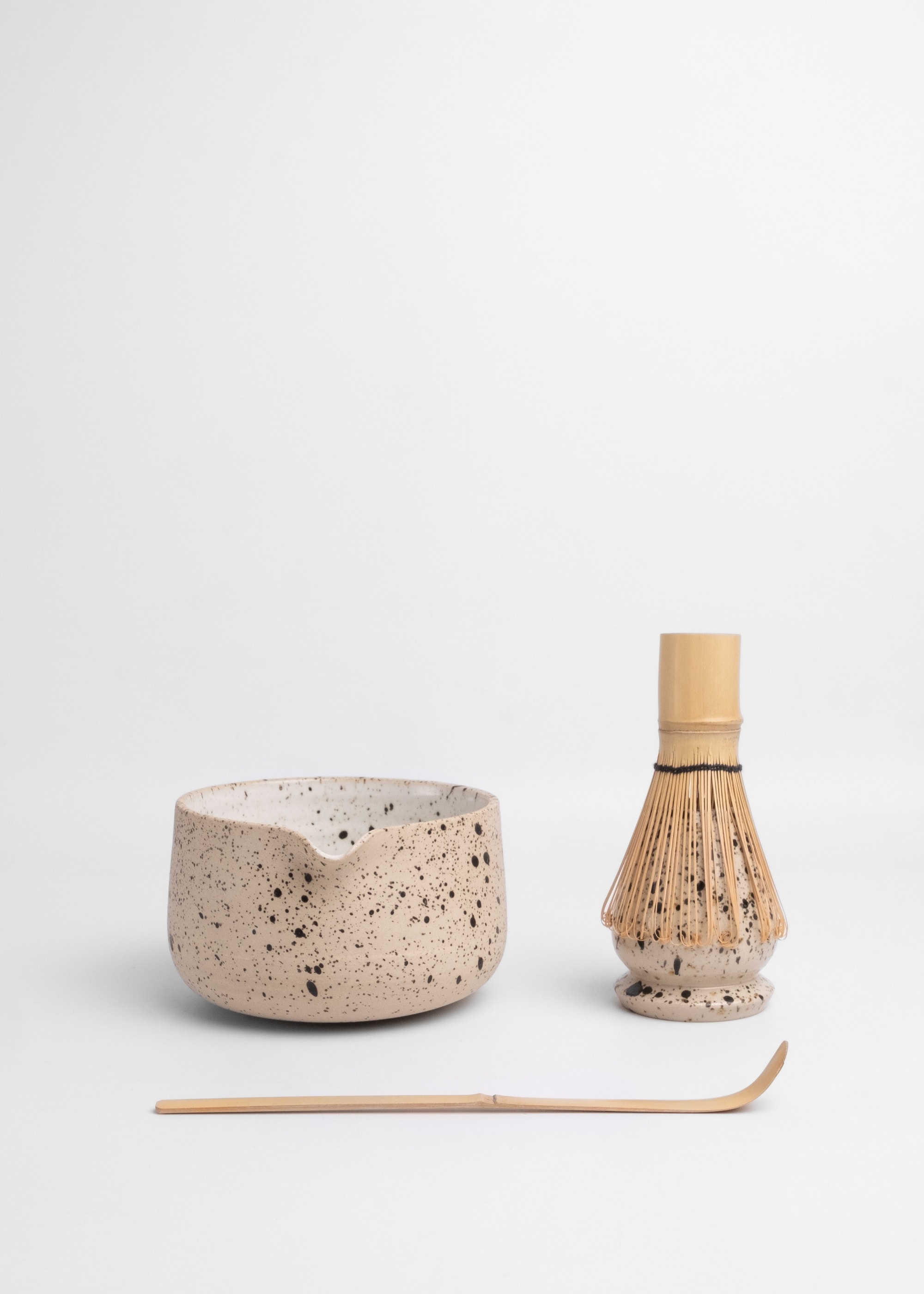 Minimal speckled beige stoneware ceramic matcha set. Choose between the full set, matcha cup, matcha bowl with spout and whisk holder.