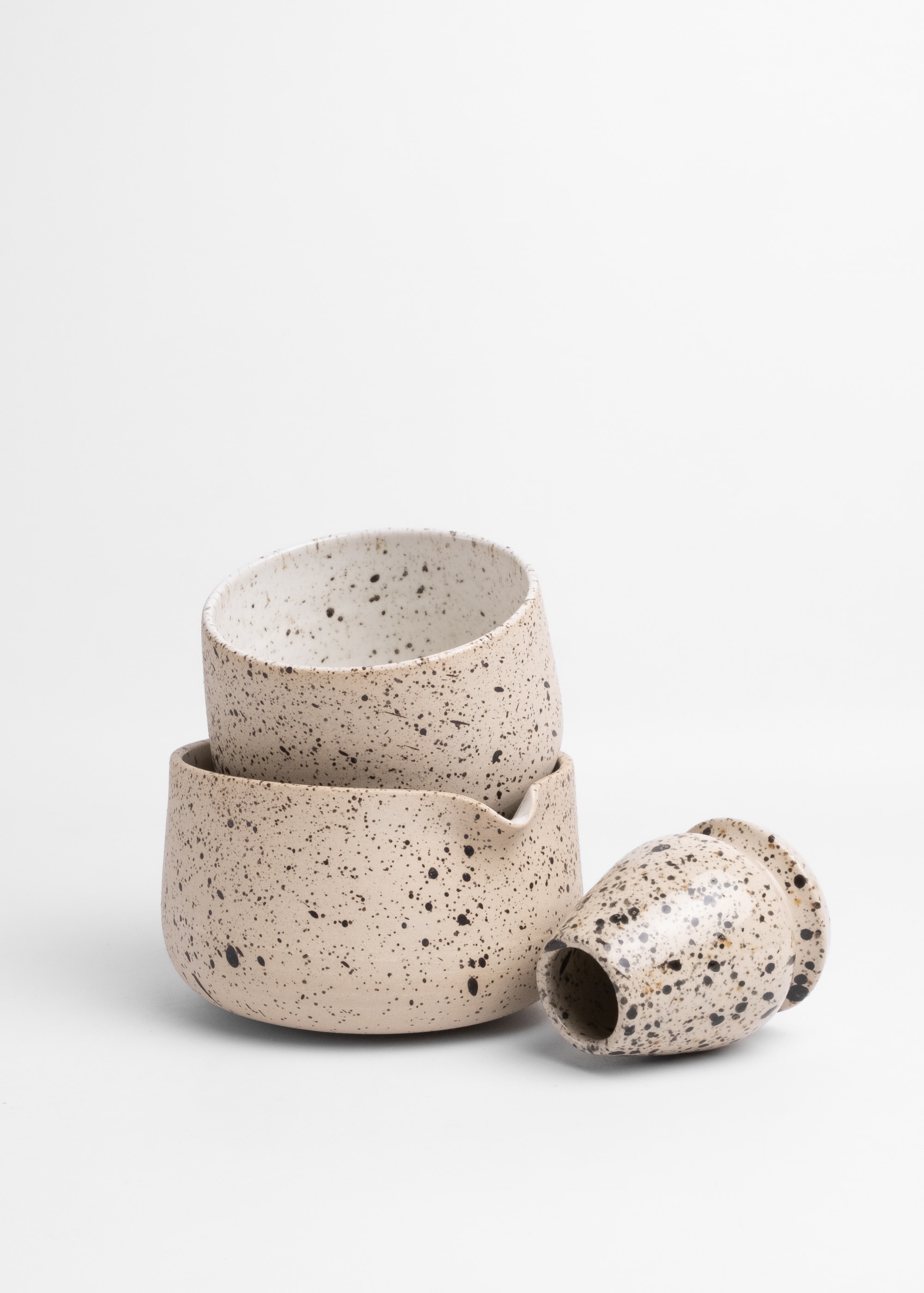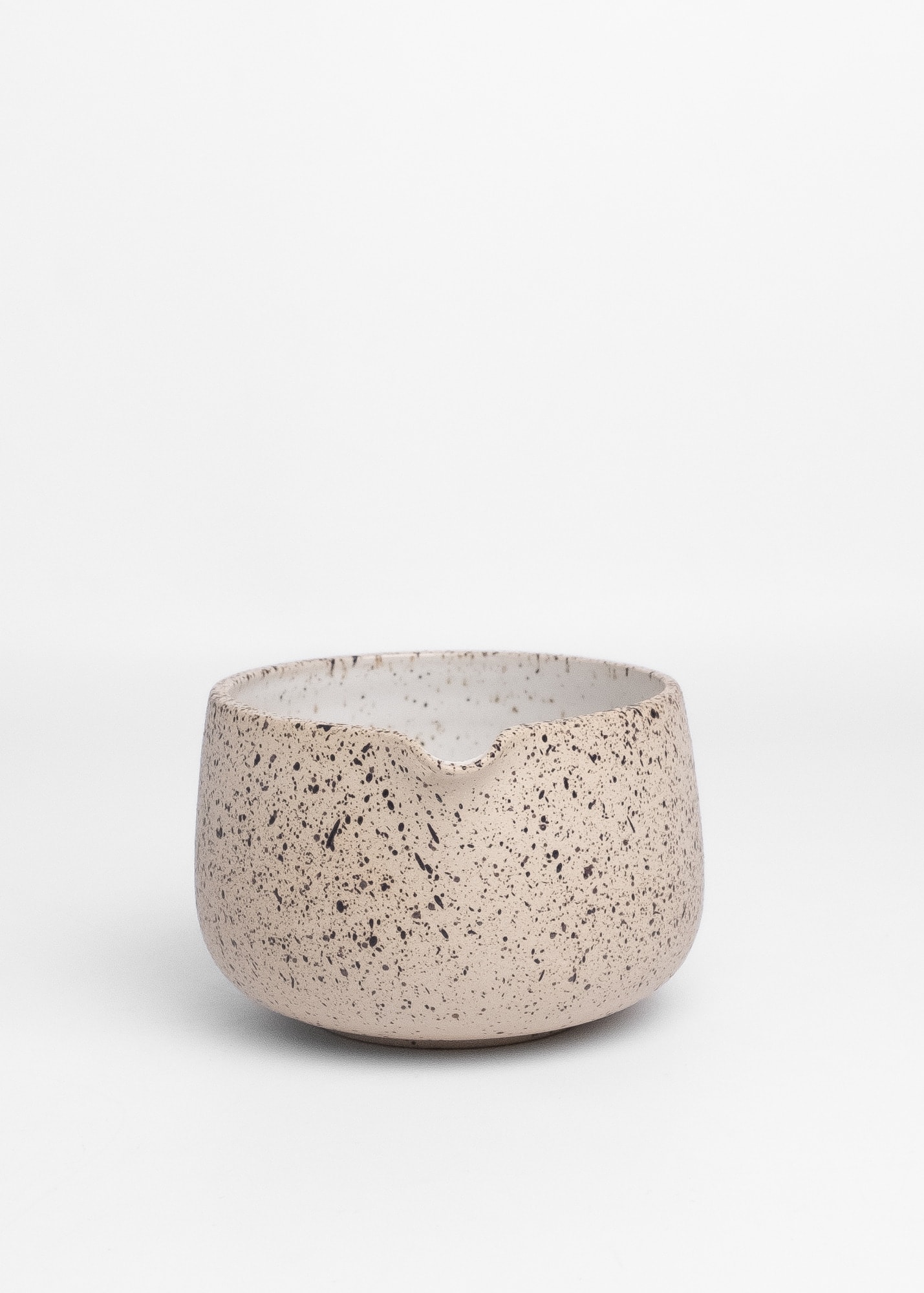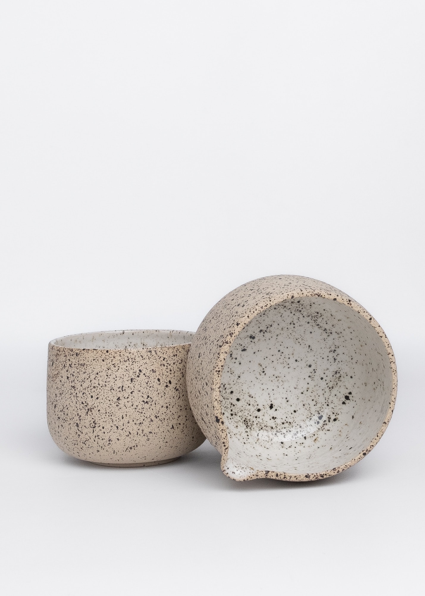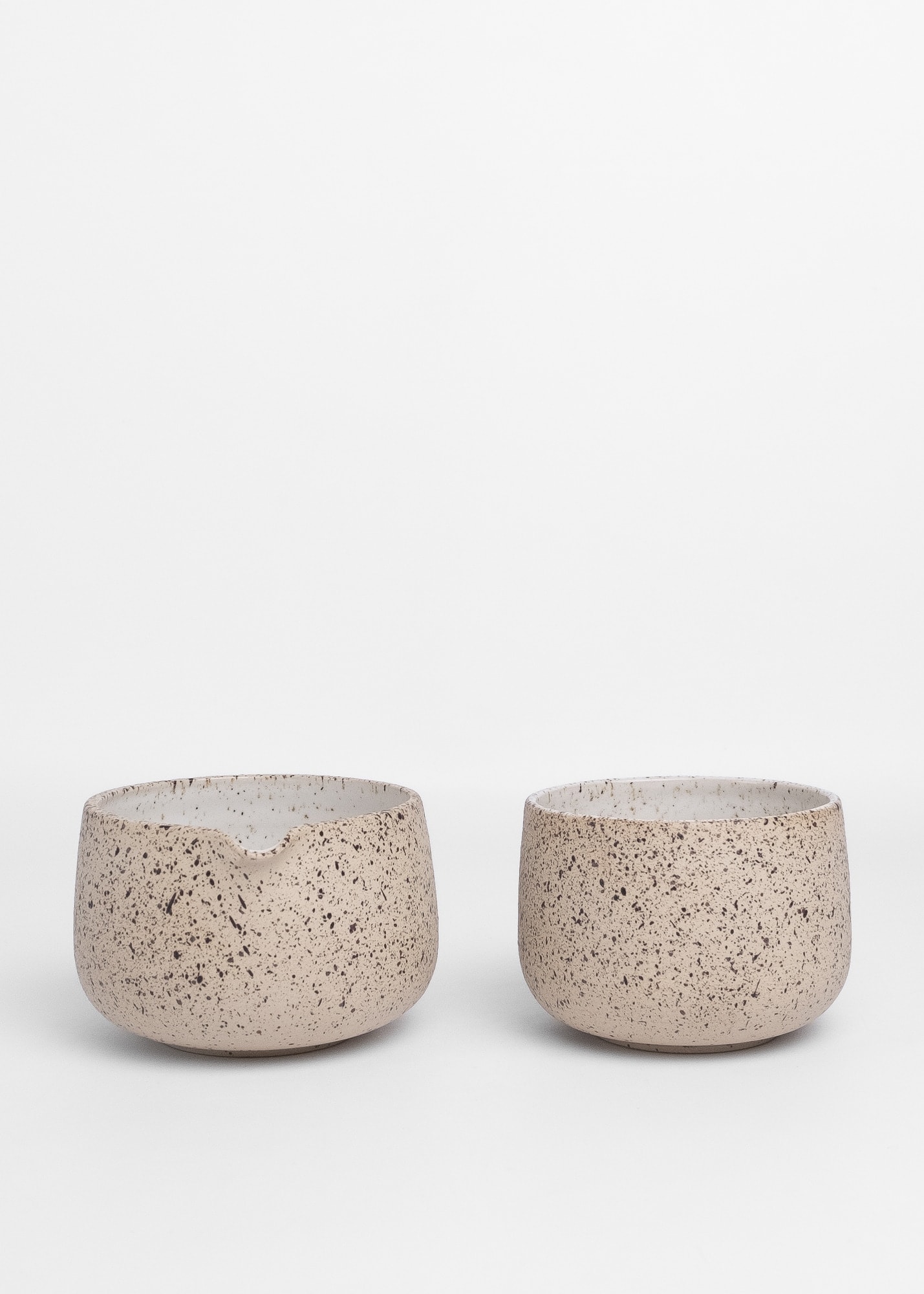 Minimal speckled beige stoneware ceramic matcha set. Choose between the full set, matcha cup, matcha bowl with spout and whisk holder.