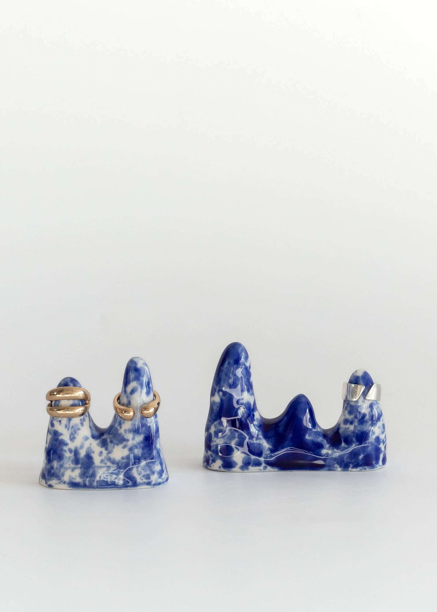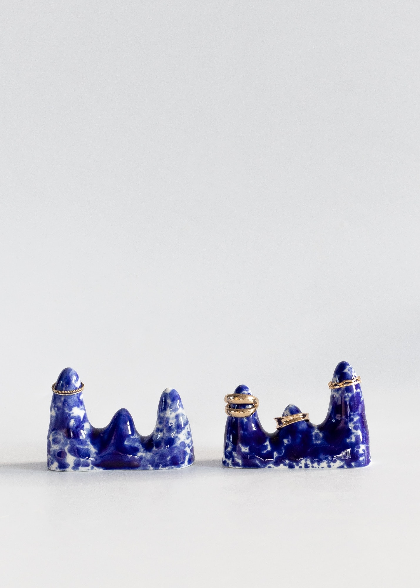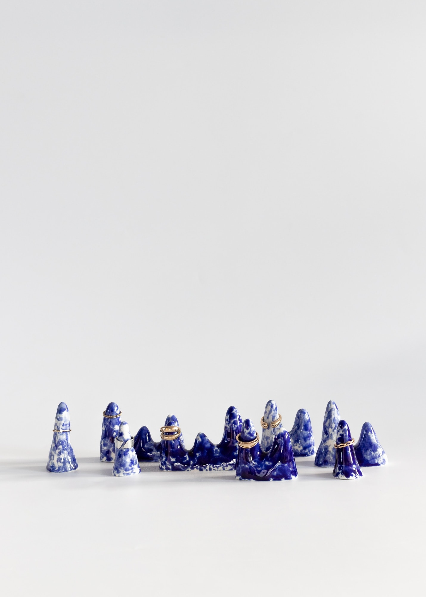 Mountain-shaped cones for rings made from porcelain with cobalt splashes.