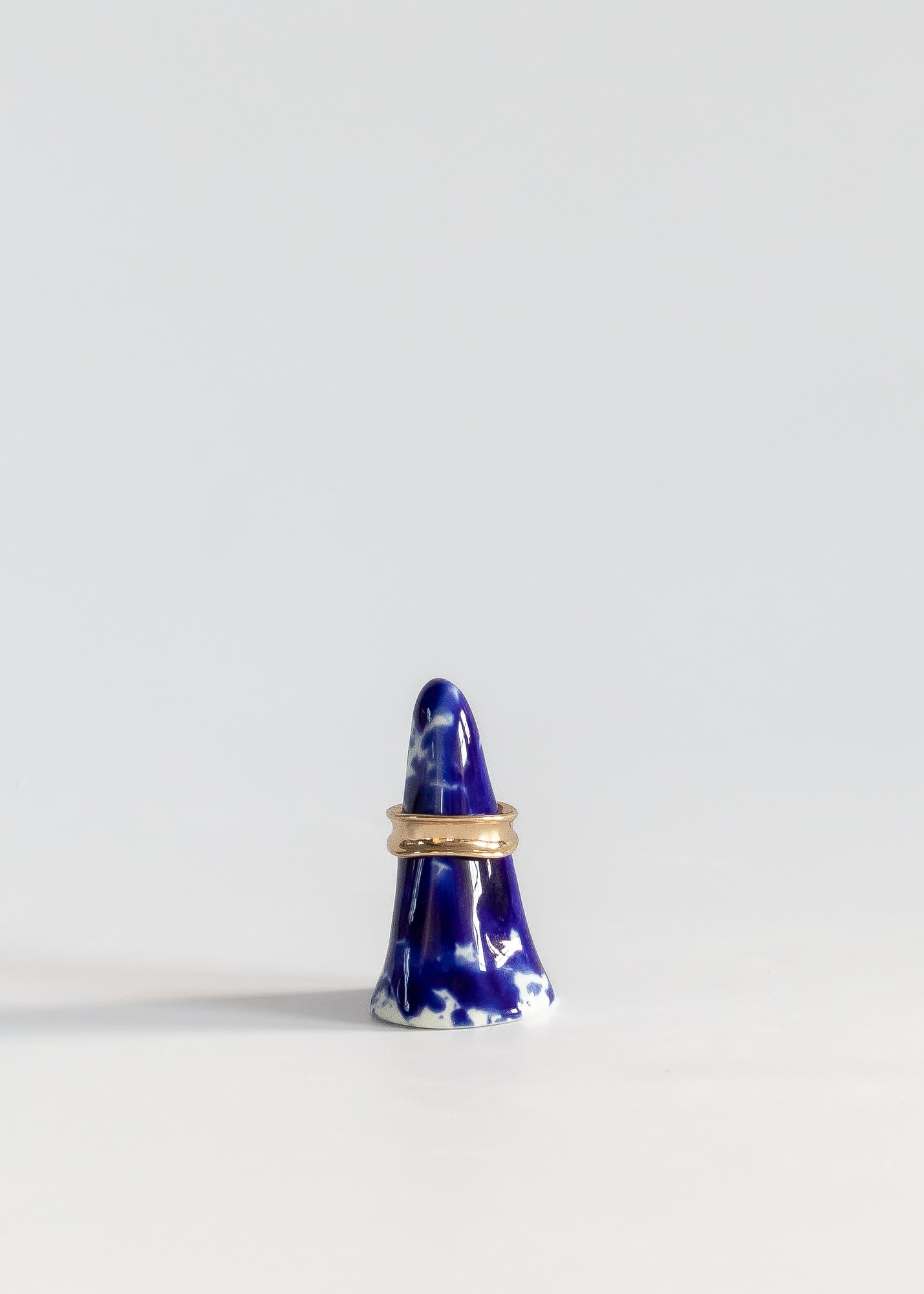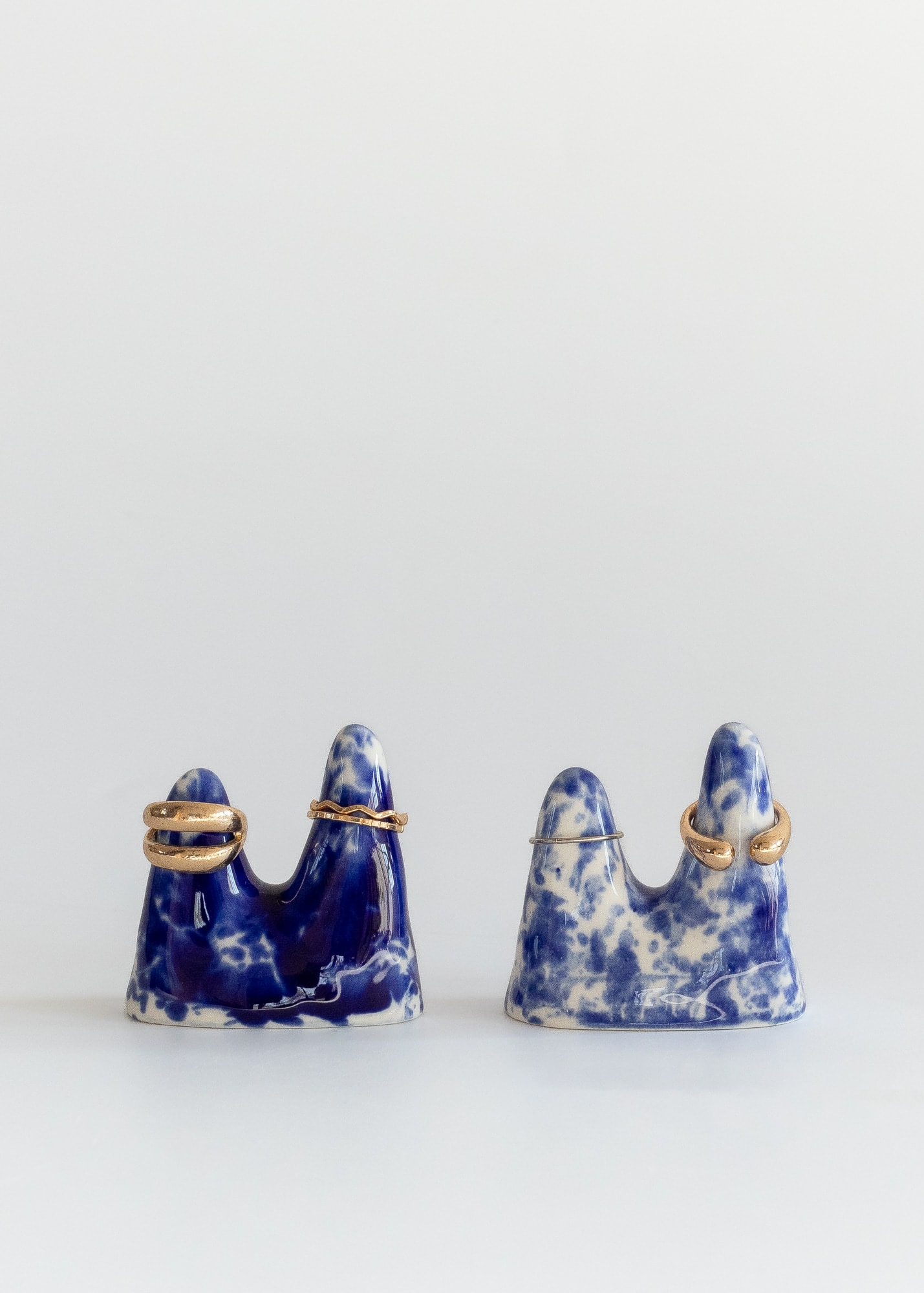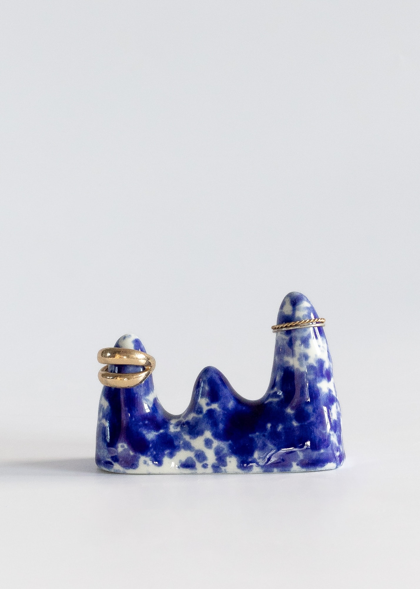 Mountain-shaped cones for rings made from porcelain with cobalt splashes.