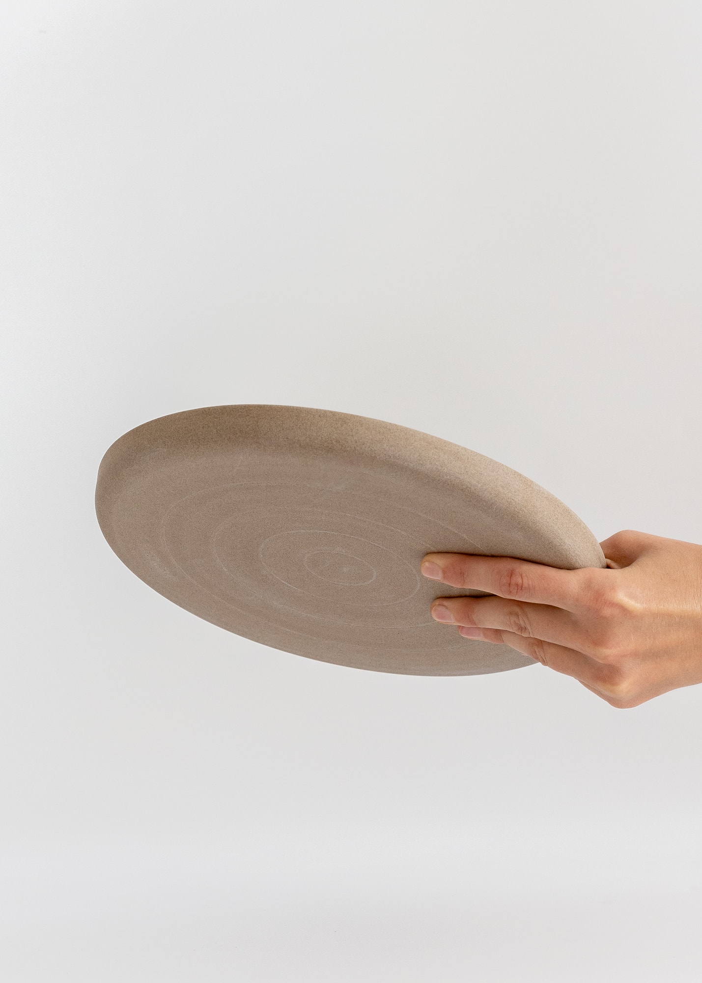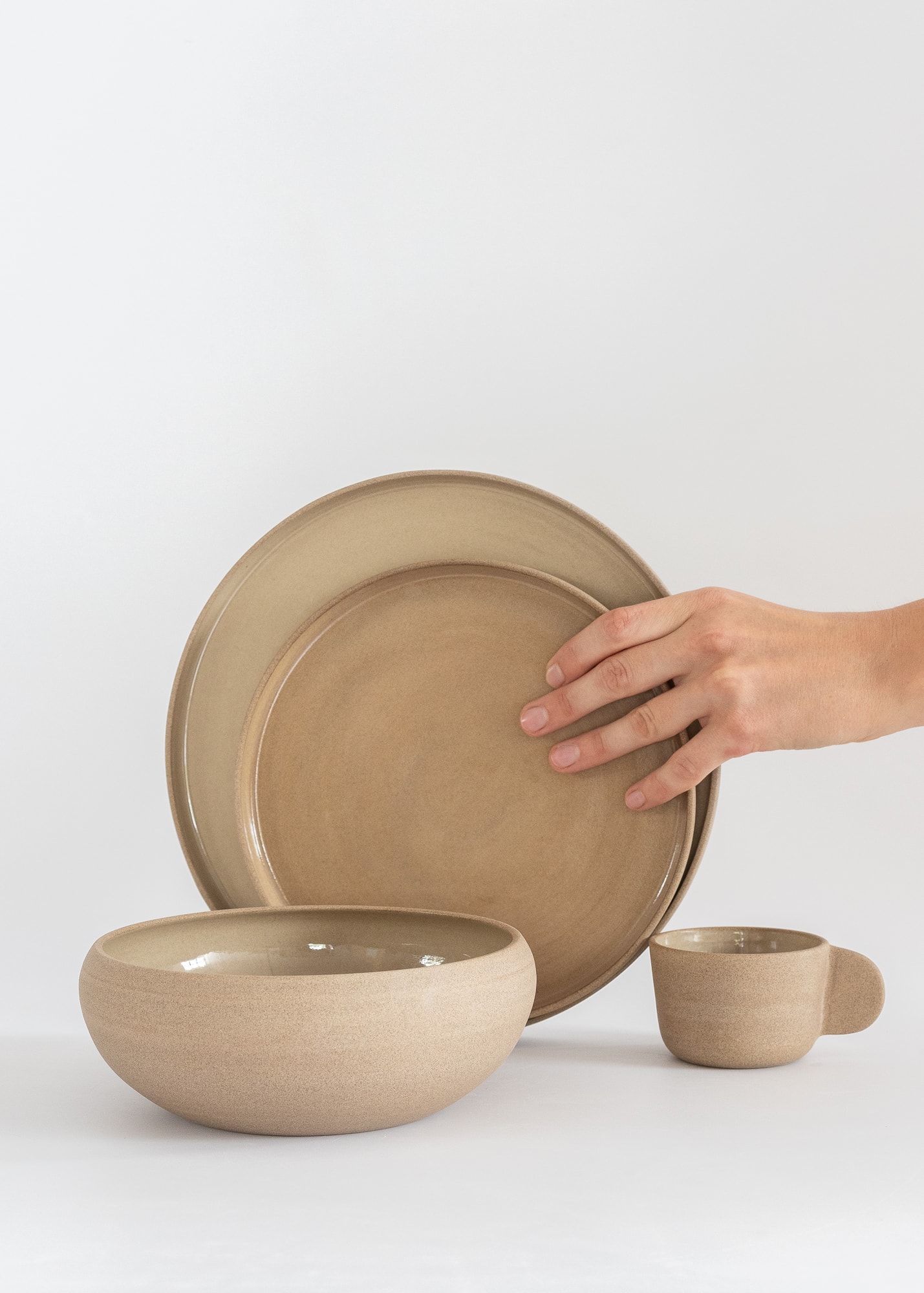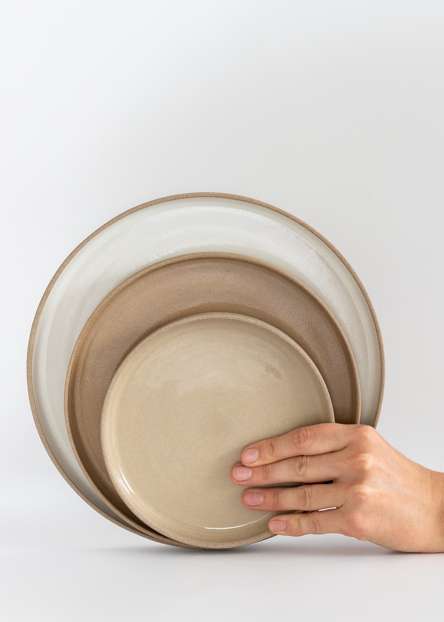 Minimal light brown tones stoneware plate with a rim. Inside covered with brown, beige, or white glossy glaze.