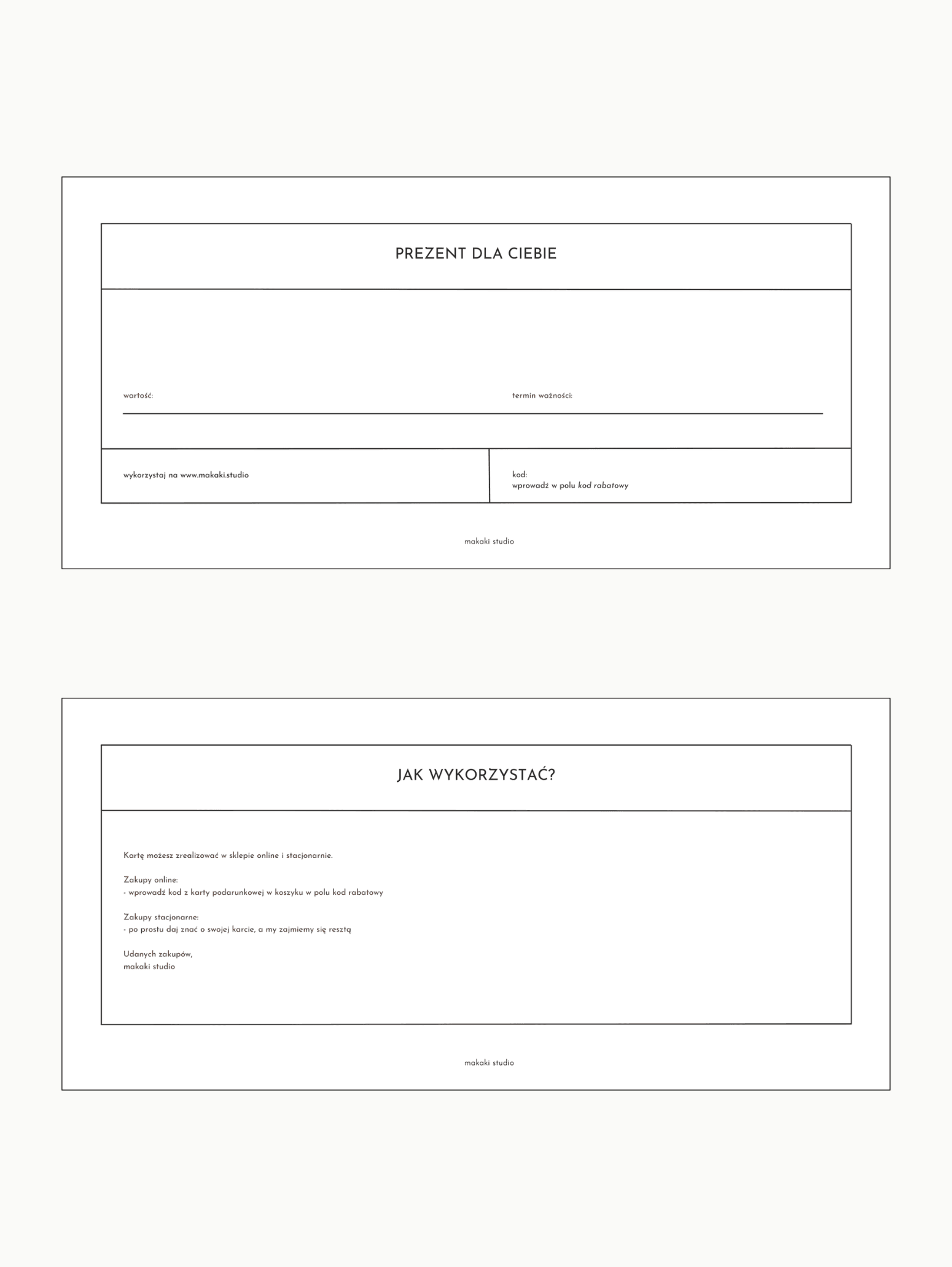 Każdą kartę możemy wypisać zgodnie z Twoja prośbą lub zostawić pustą. W komentarzu do zamówienia podaj nam dane, które powinny się na niej znaleźć (od kogo, dla kogo), możesz dodać też notkę od siebie. Na karcie umieścimy dedykowany kod, który wprowadzony podczas składania zamówienia na naszej stronie internetowej obniży kwotę do zapłaty.