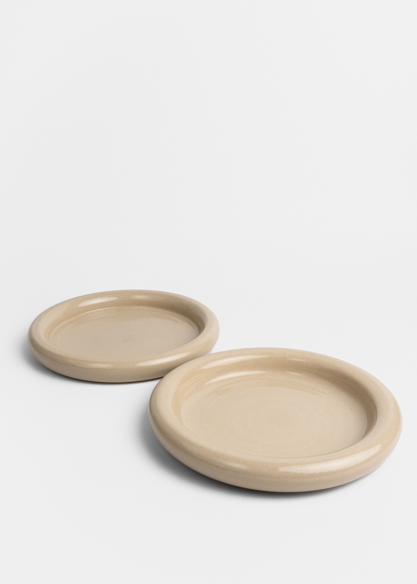 Minimal light brown tones chunky stoneware plate in a donut shape.