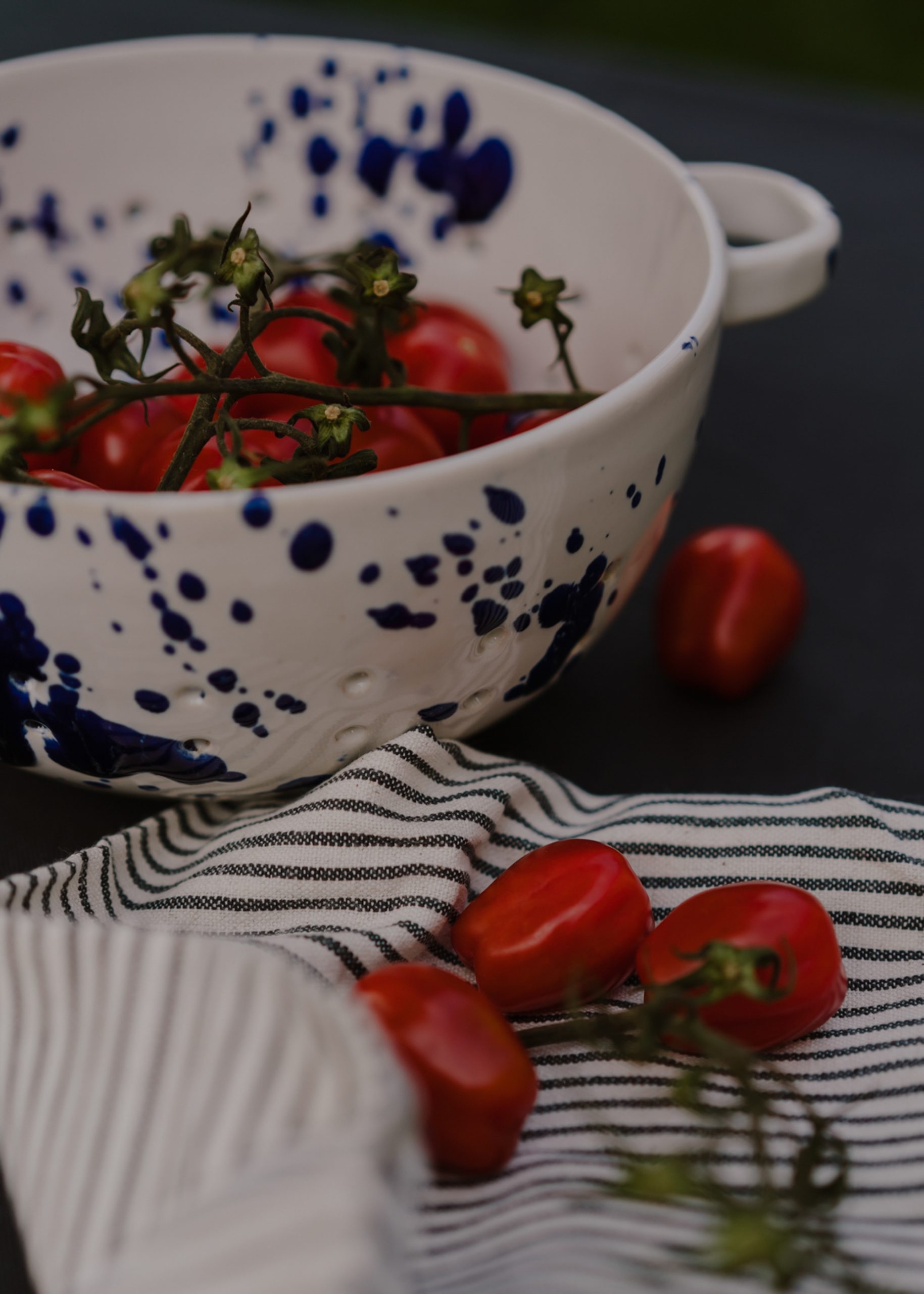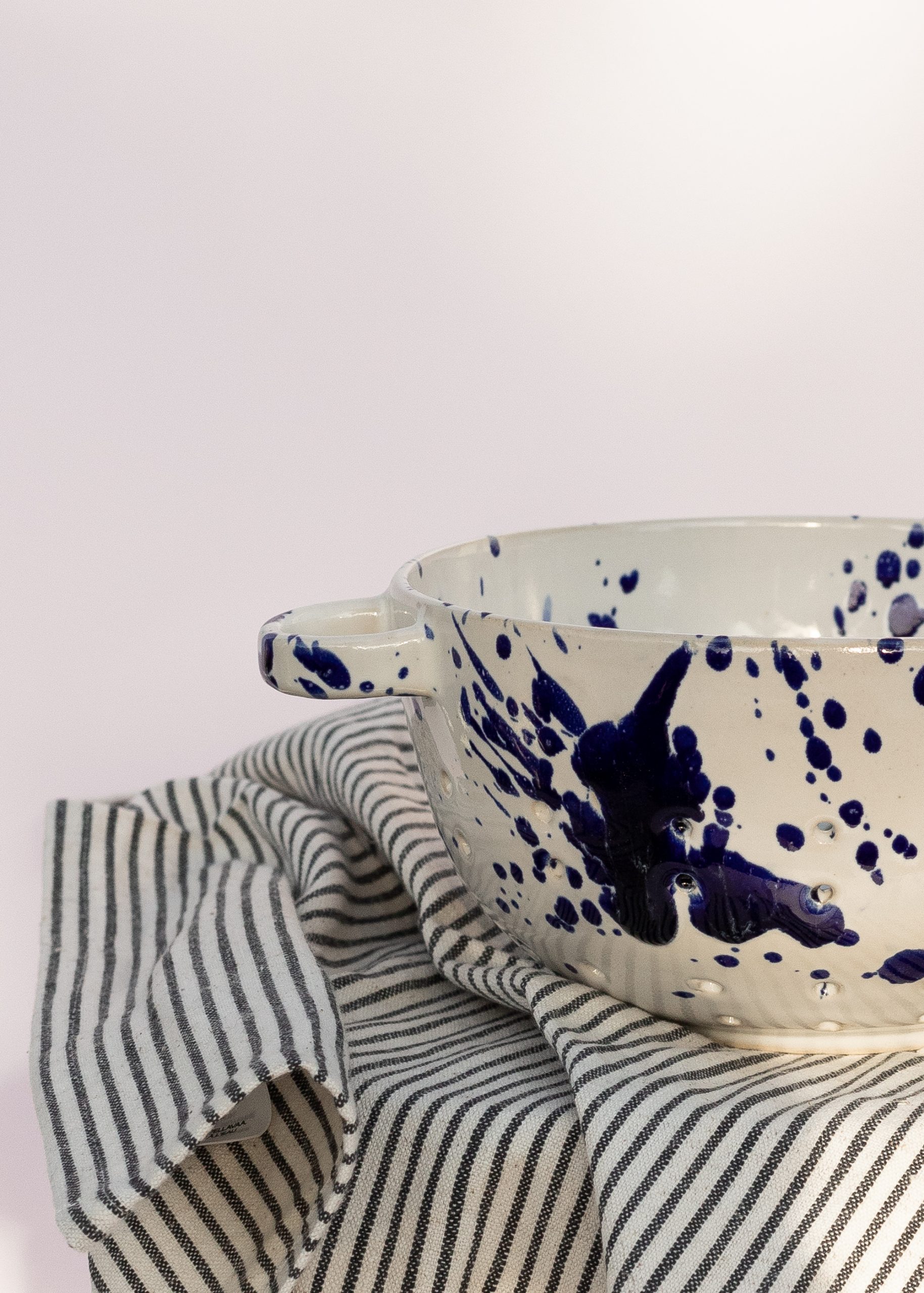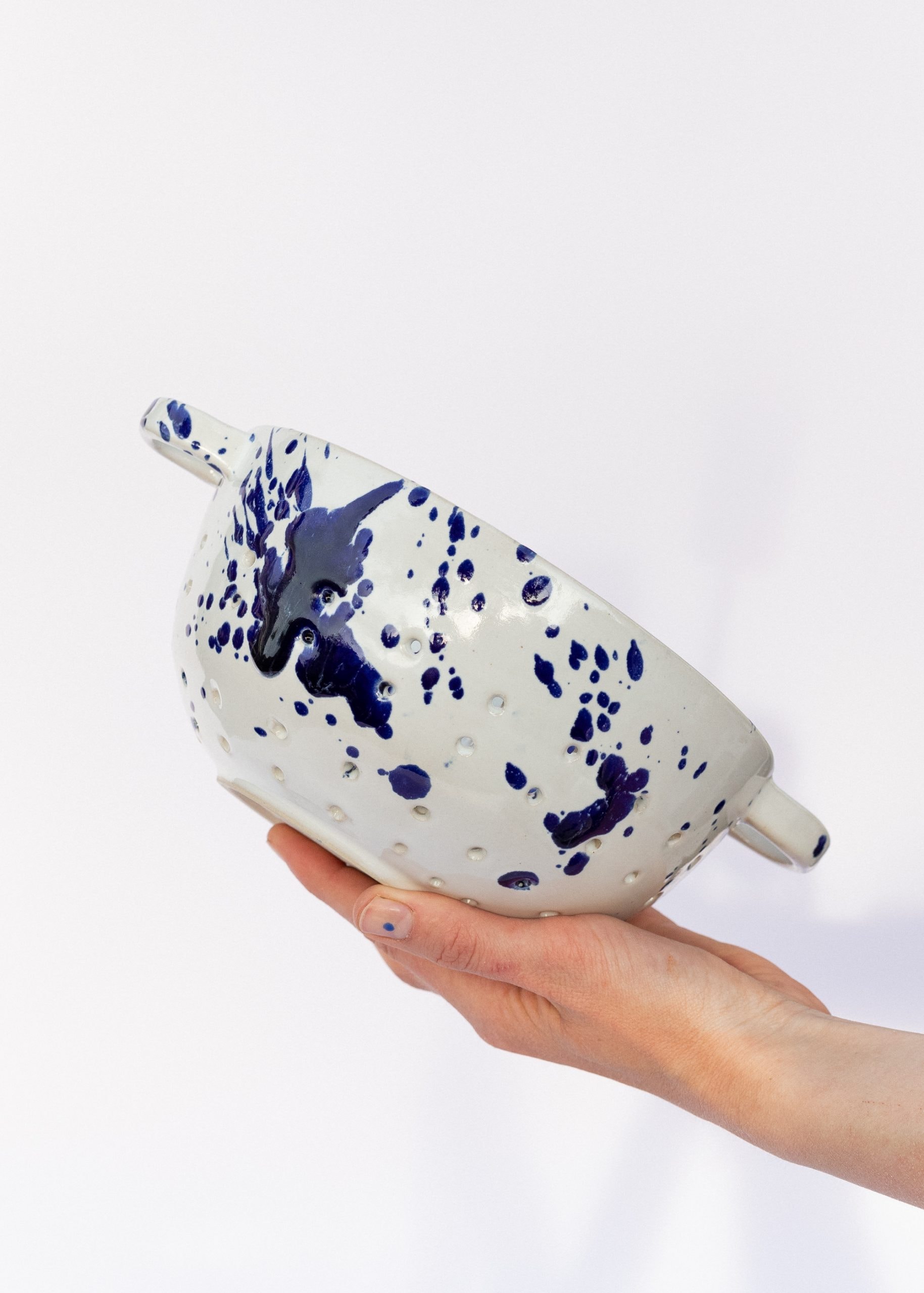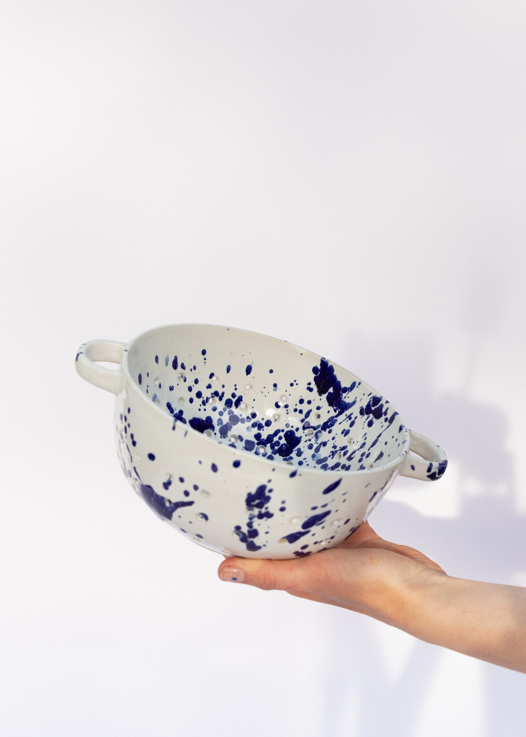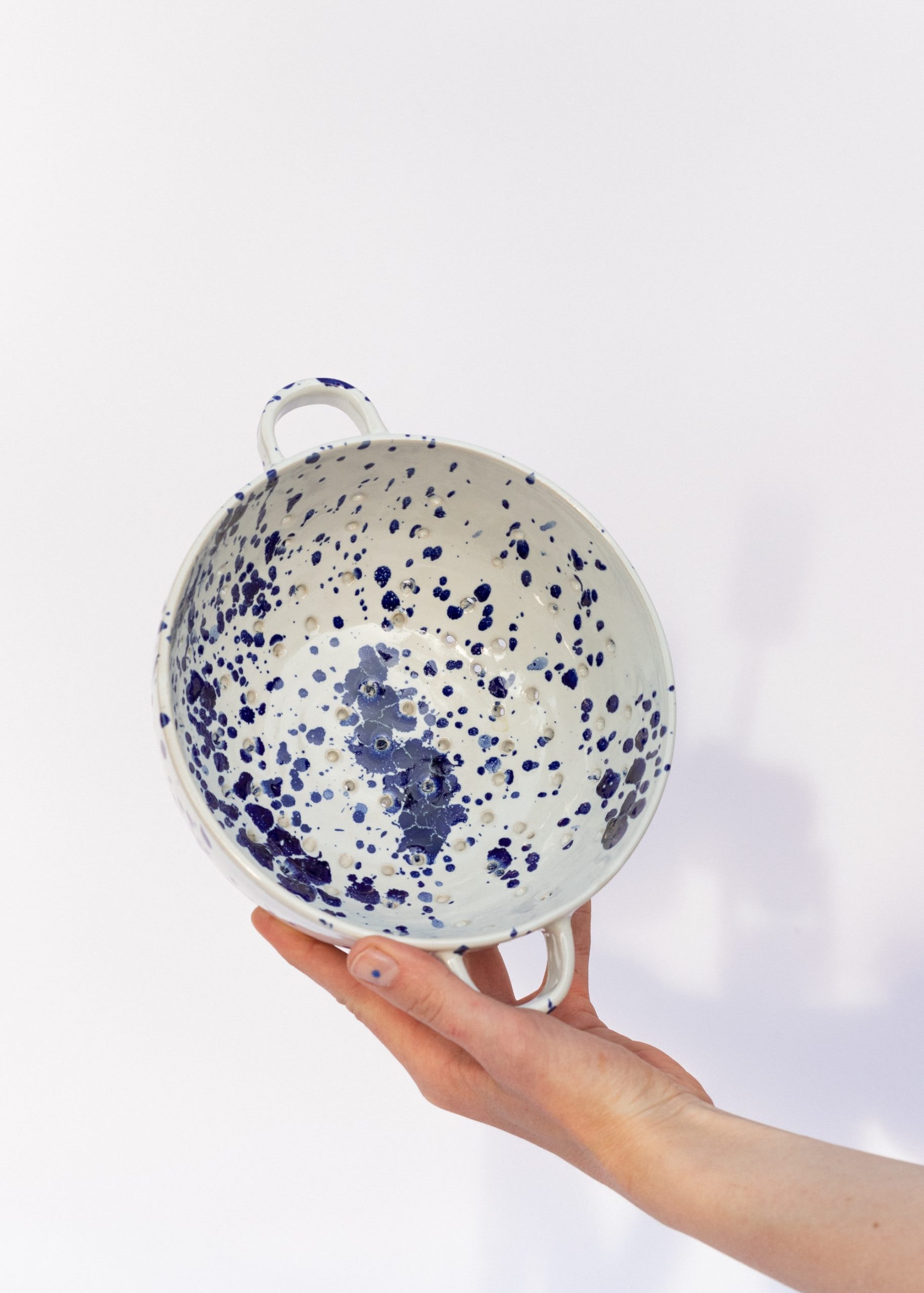 Biały durszlak z kamionki z kobaltowymi plamkami.