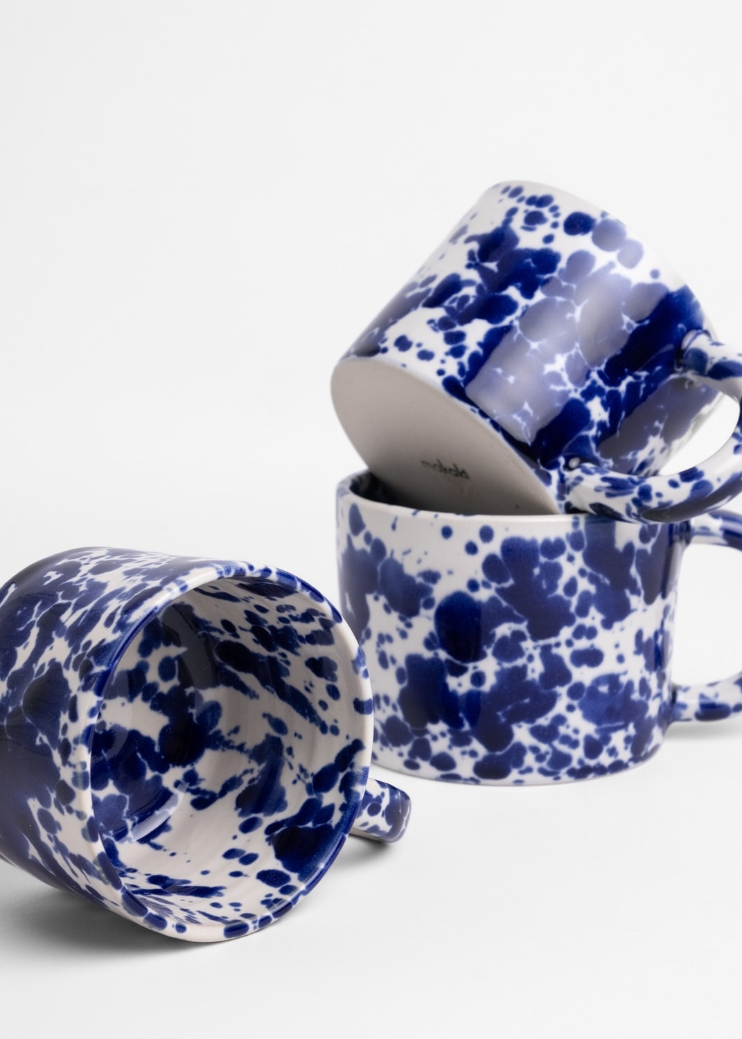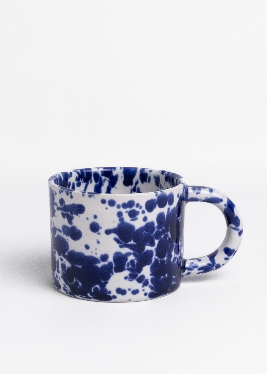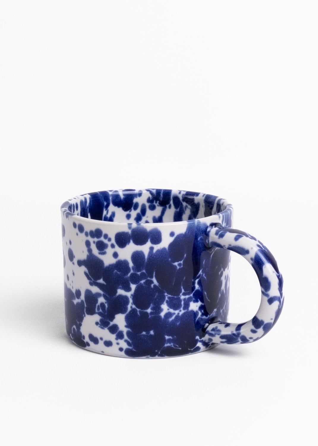 Bia艂y kubek z uchem z kamionki z kobaltowymi plamkami.