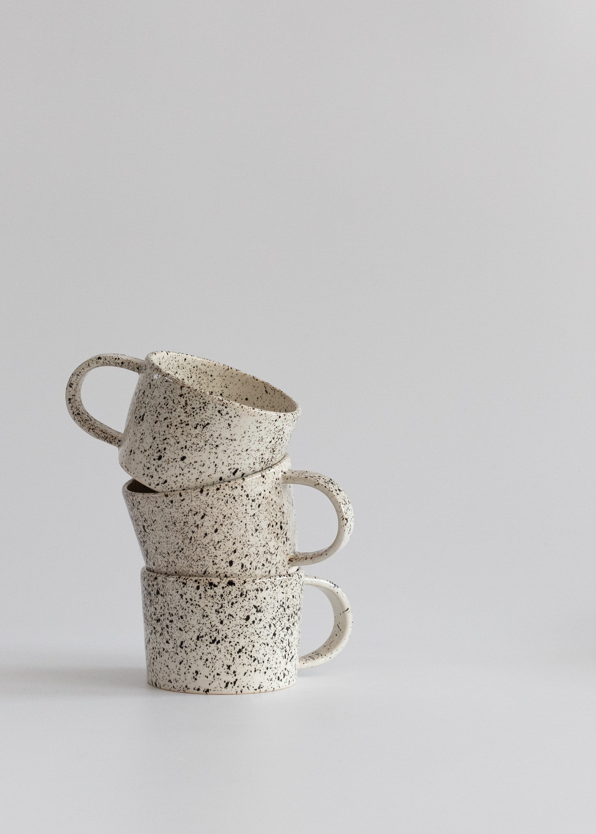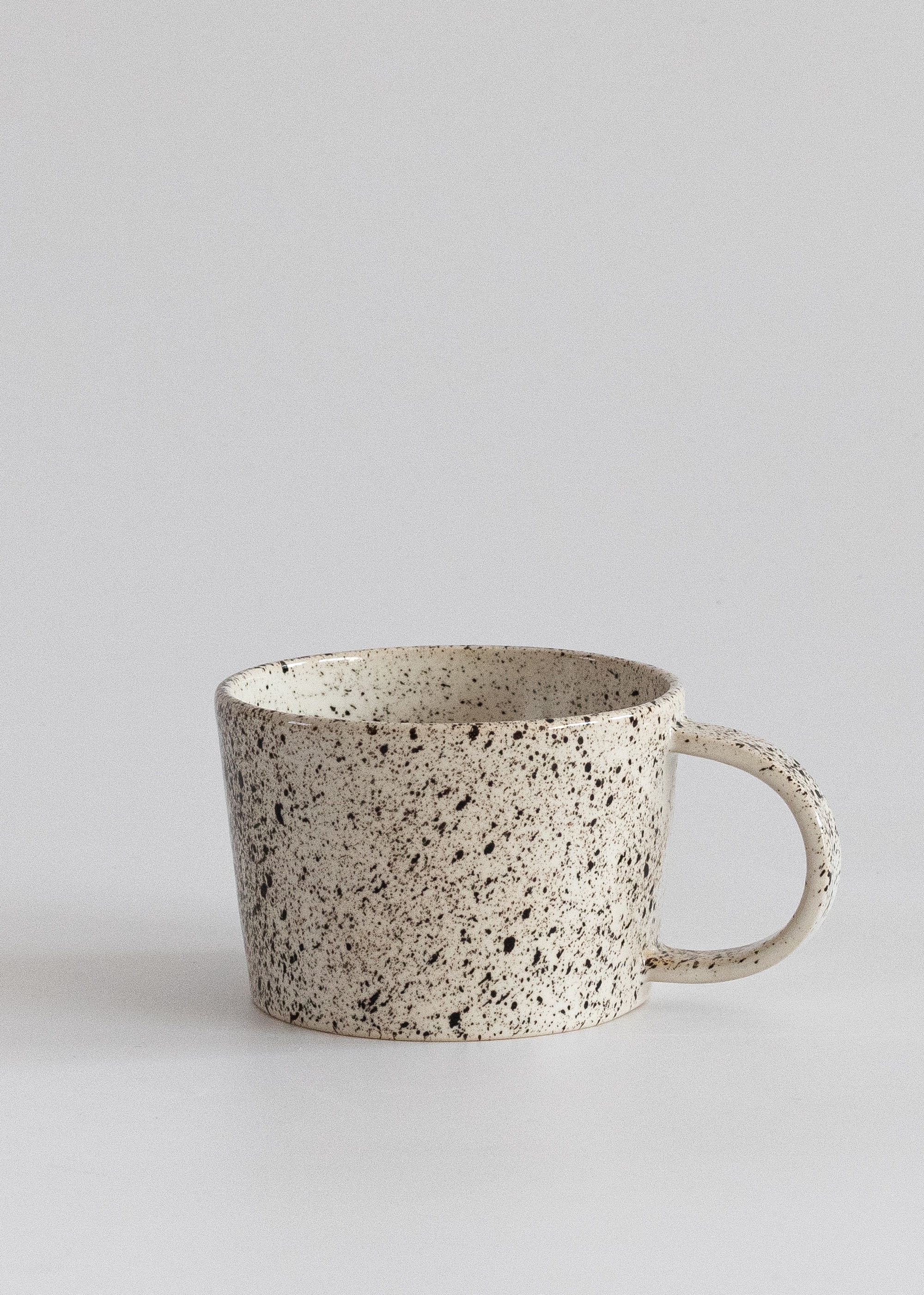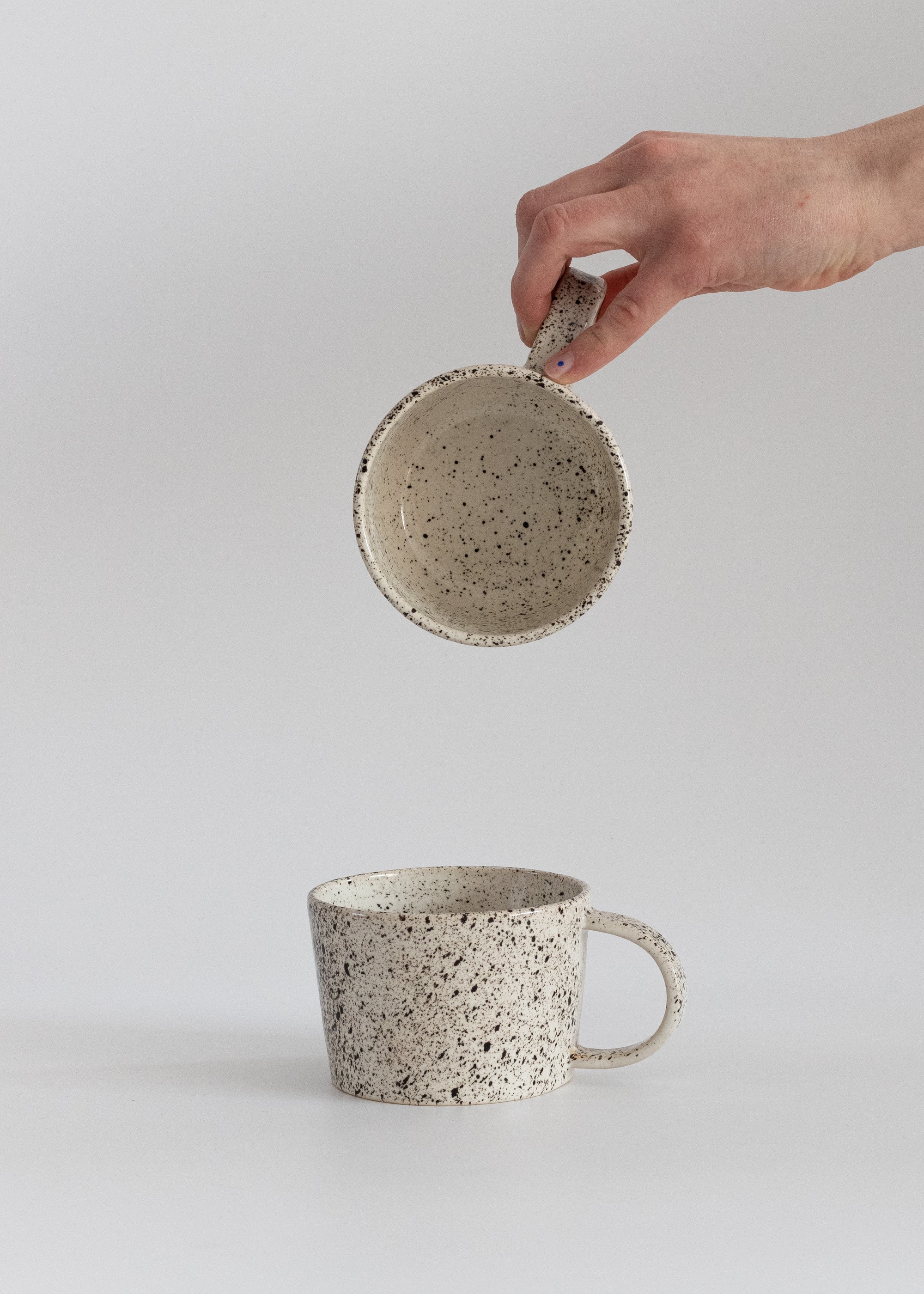 Biały kubek z uchem z kamionki z czarnymi kropkami.