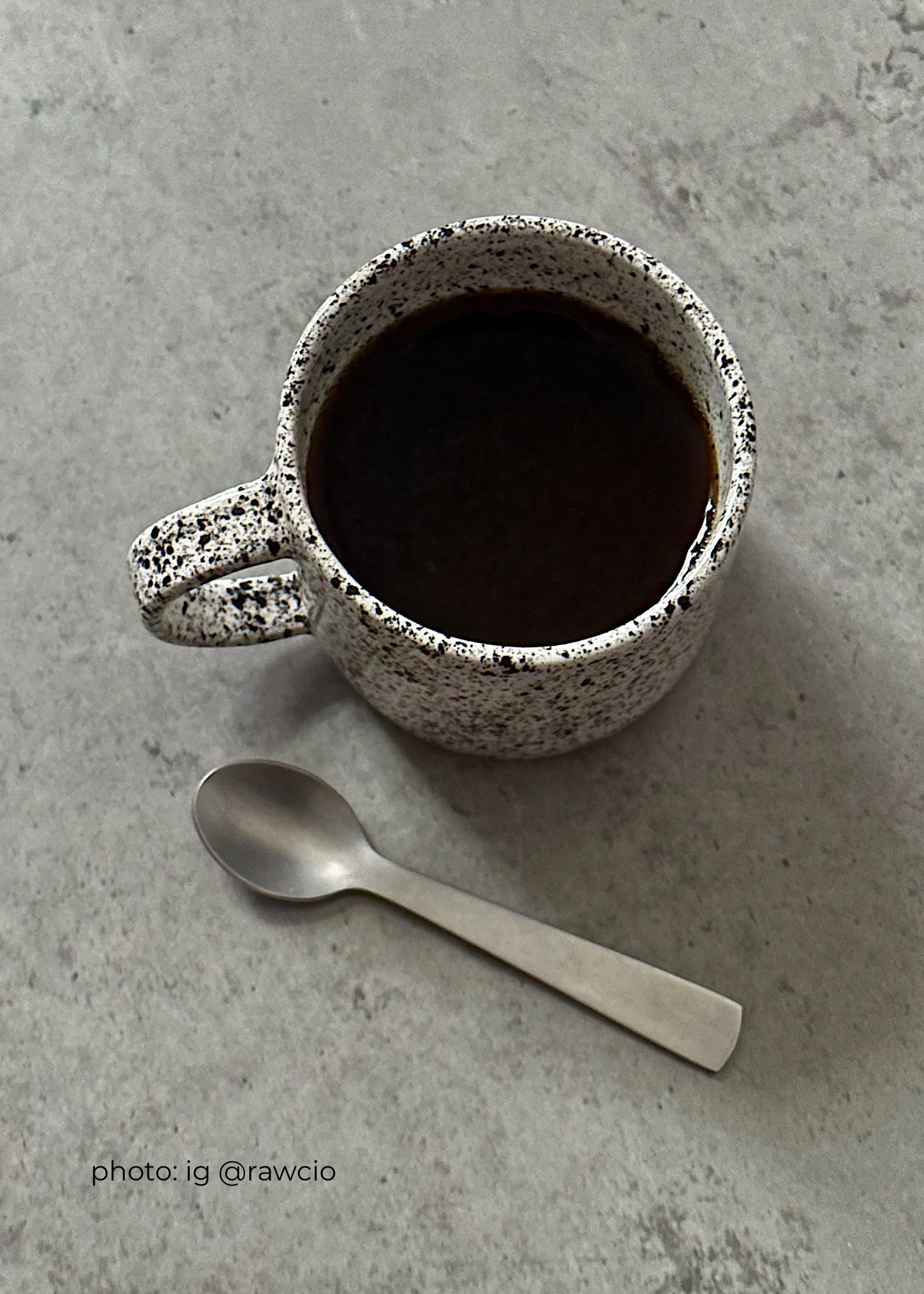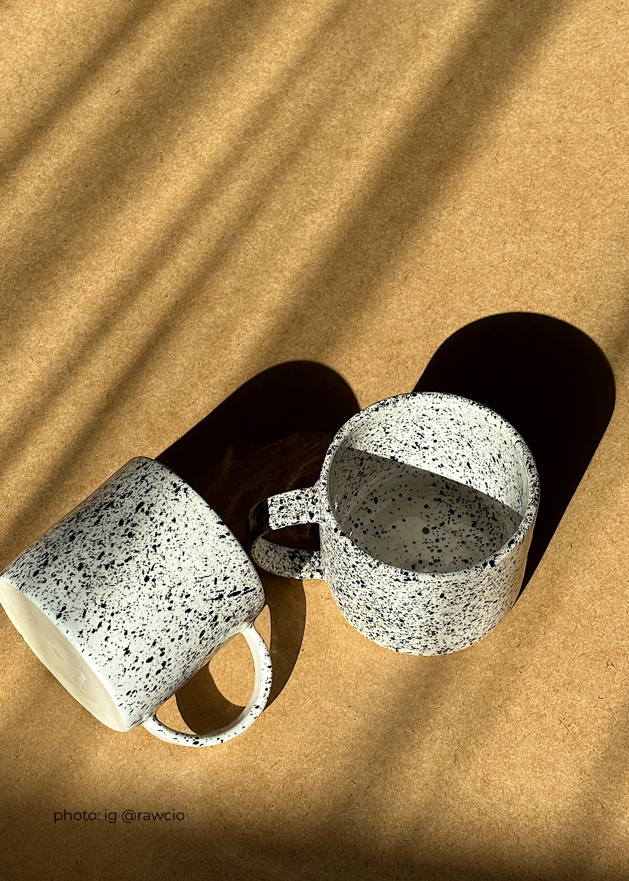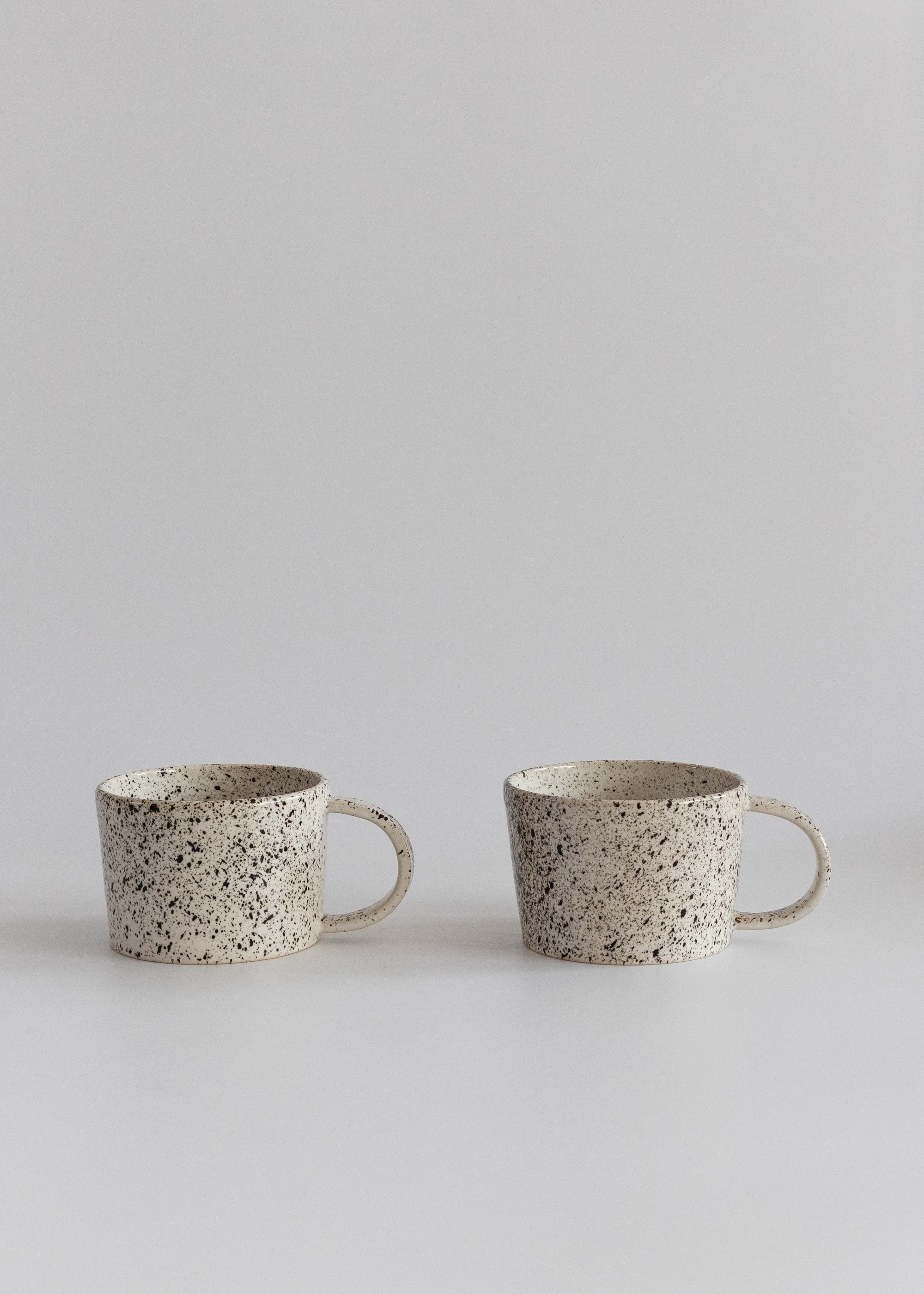 Biały kubek z uchem z kamionki z czarnymi kropkami.