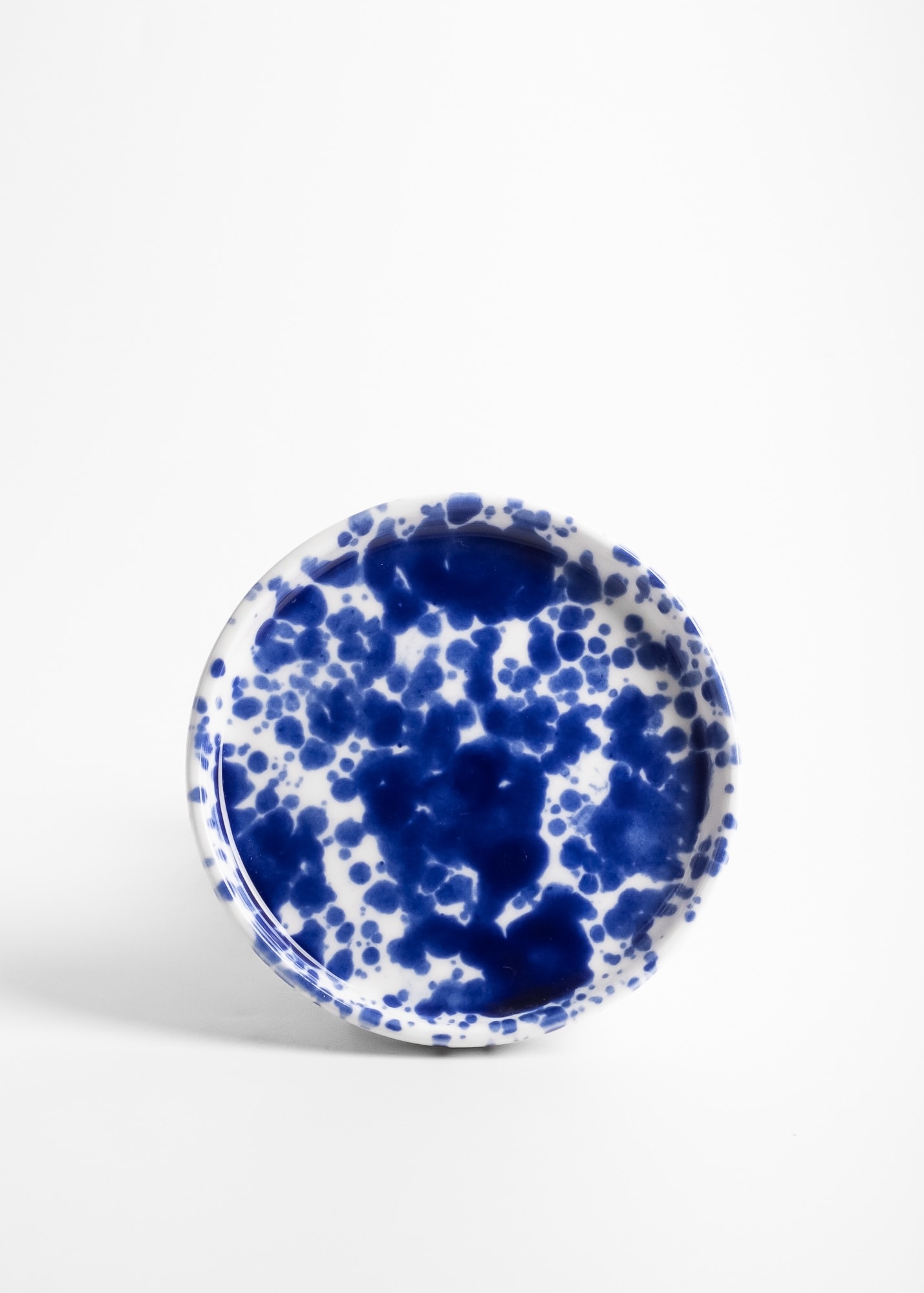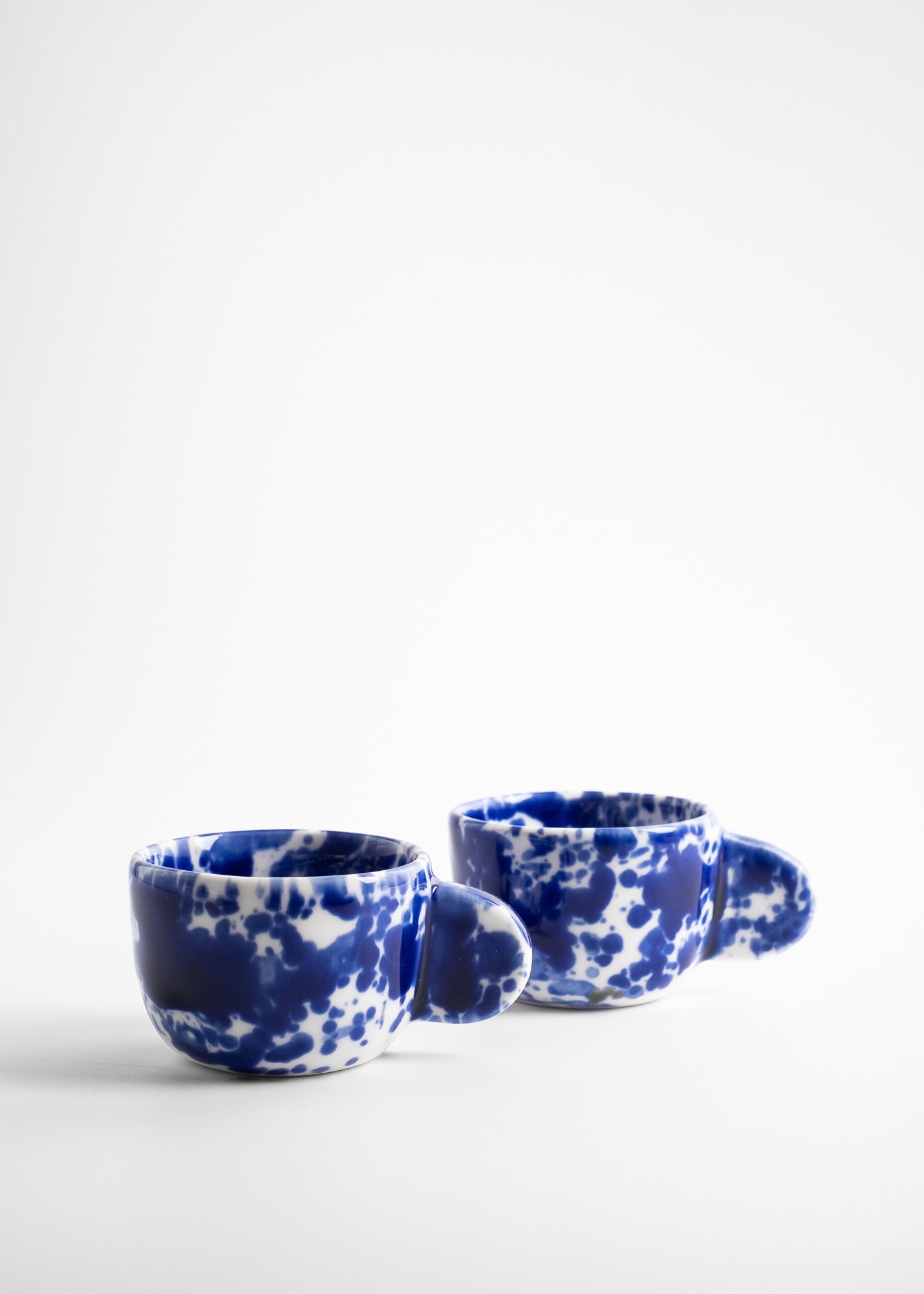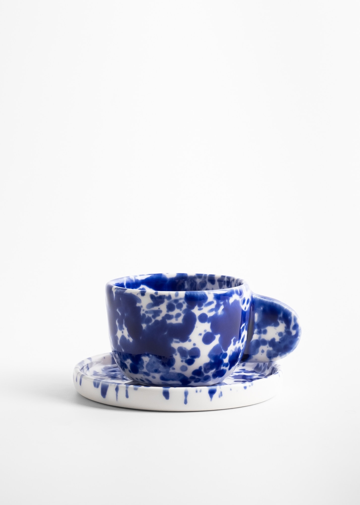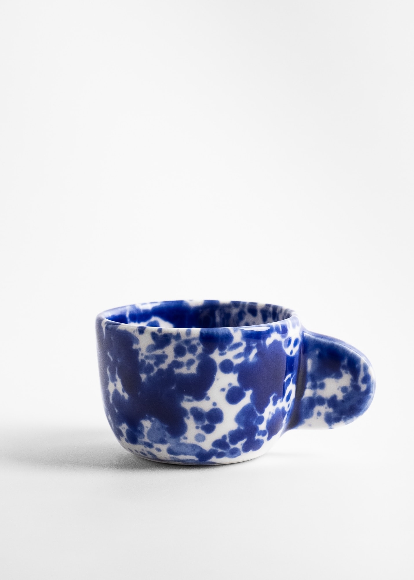 Kubek z uchem do espresso, z kobaltowym nakrapianiem, wykonany z porcelany.