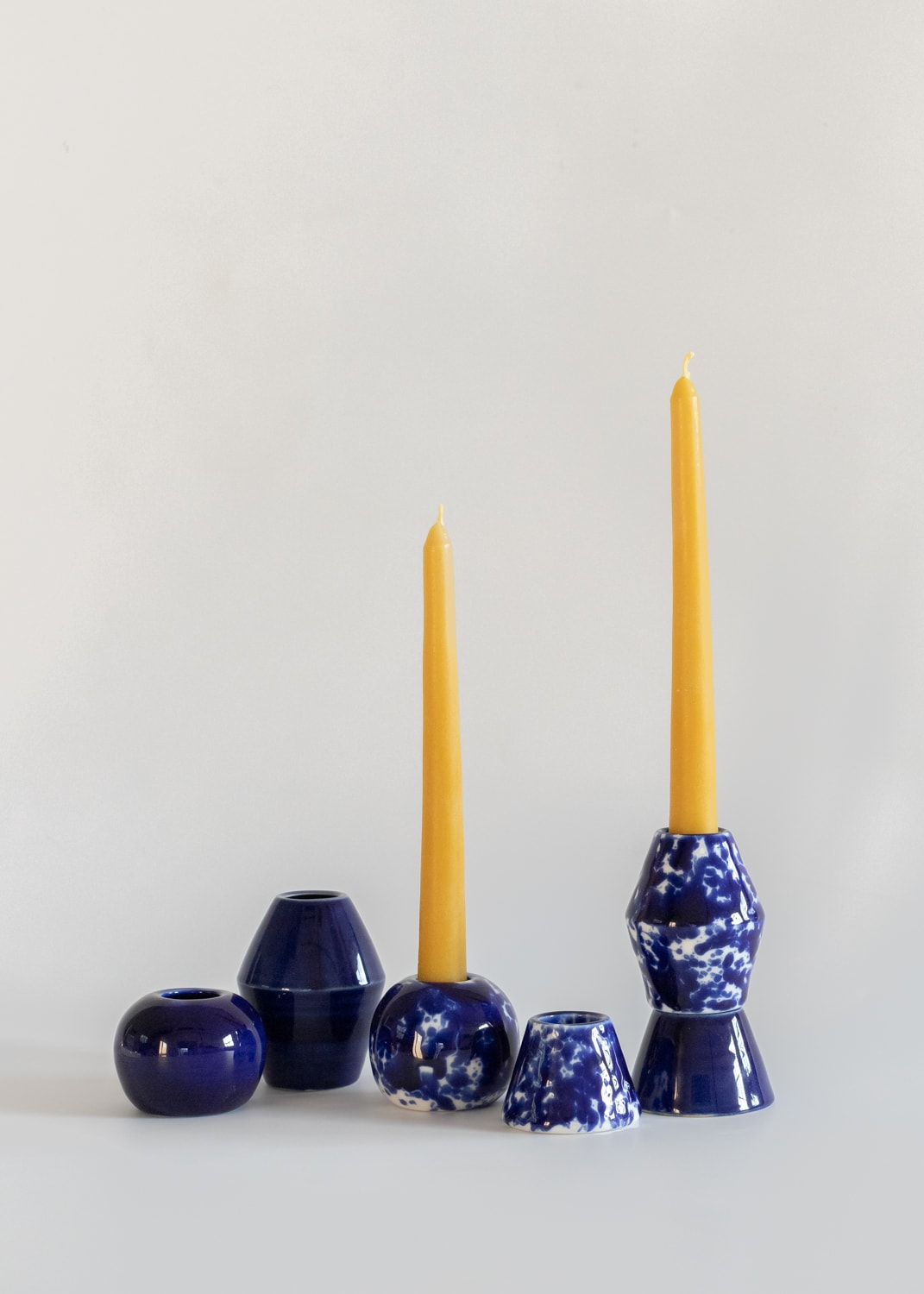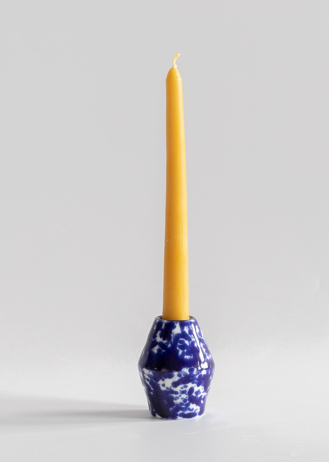 Biały porcelanowy świecznik z kobaltowymi plamkami.