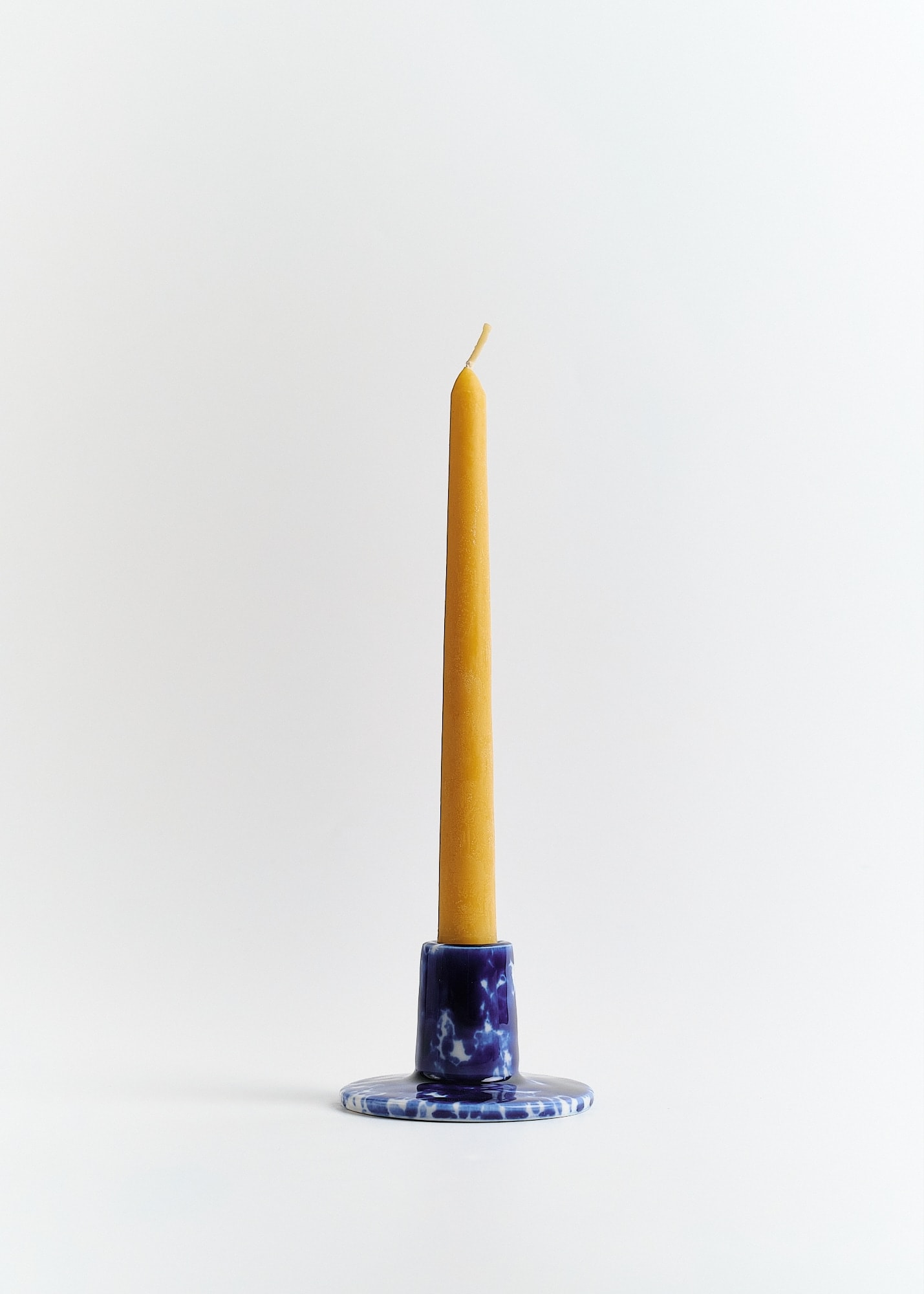 Biały porcelanowy świecznik z kobaltowymi plamkami.