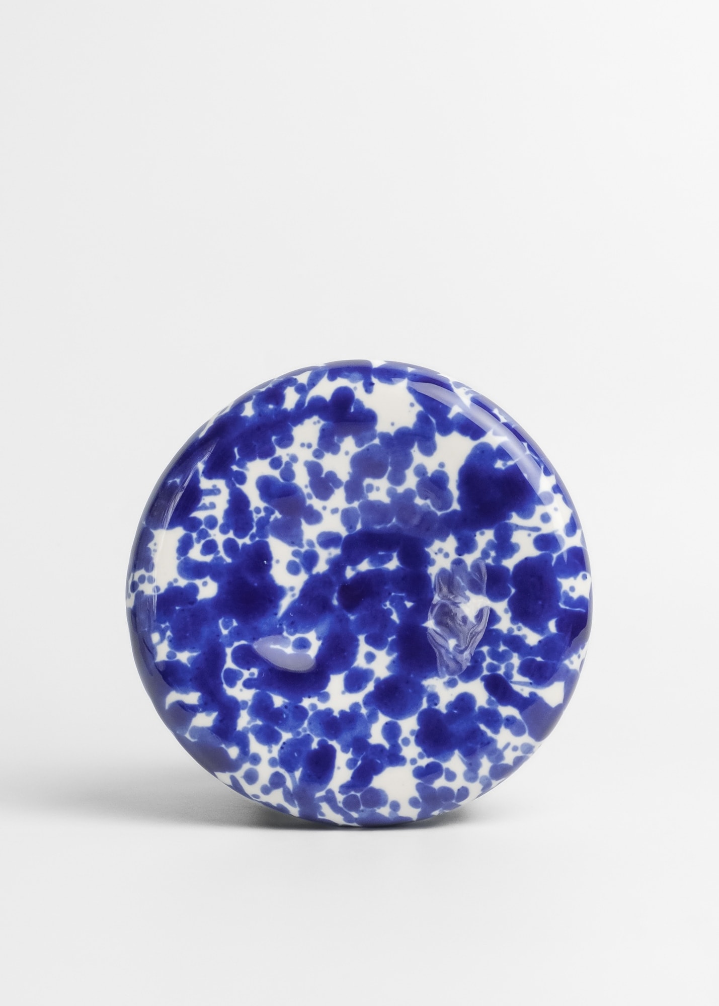 Gruby porcelanowy talerz z kobaltowymi plamkami i wygięciem na środku.