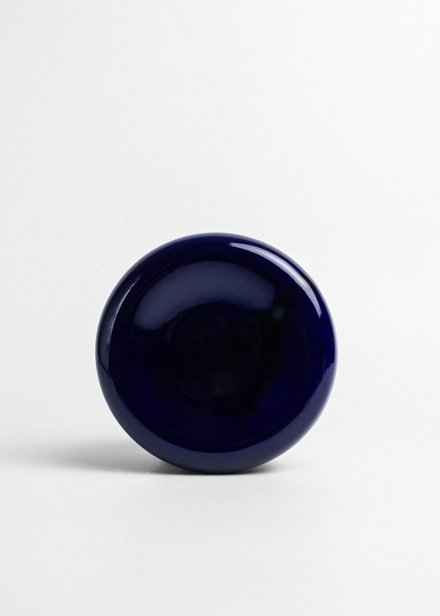 Gruby talerz z kamionki, w kolorze głębokiego kobaltu, z wygięciem na środku.