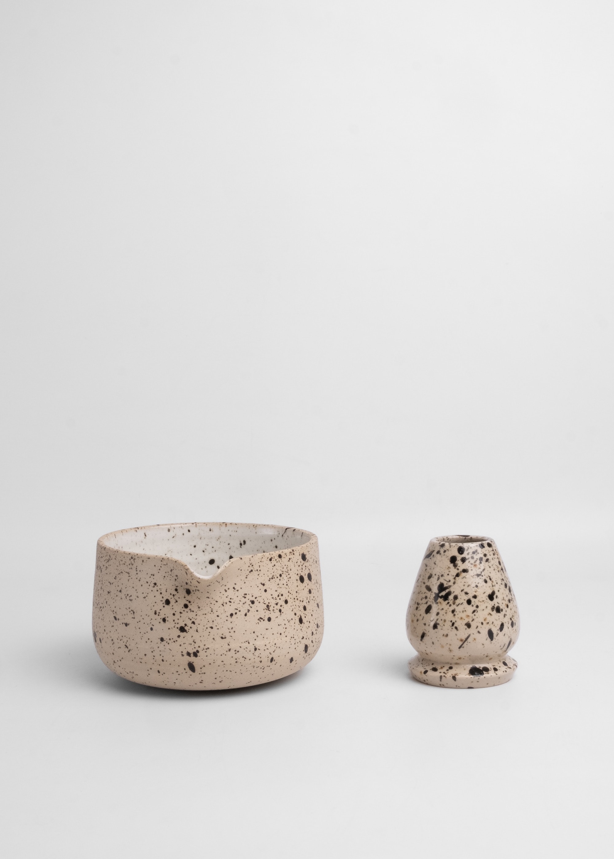 Beżowy, zdobiony czarnymi kropkami minimalistyczny zestaw do matchy. Do wyboru pełen zestaw, czarka do matchy (matchawan), miseczka do matchy z dzióbkiem i podstawka pod chasen.